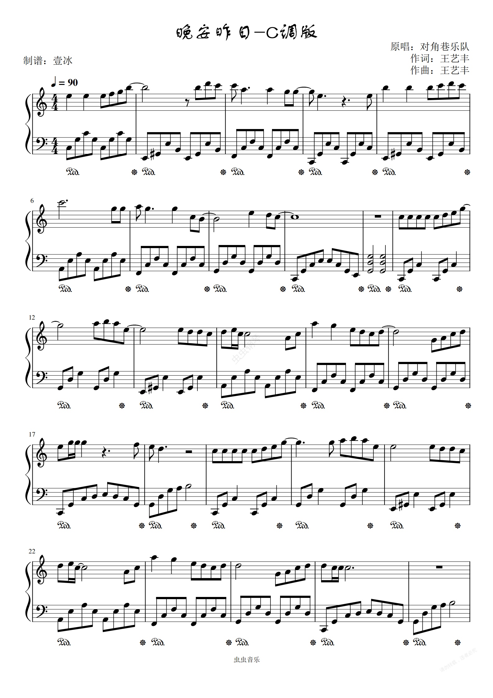 钢琴谱:晚安昨日//对角巷乐队-C调版