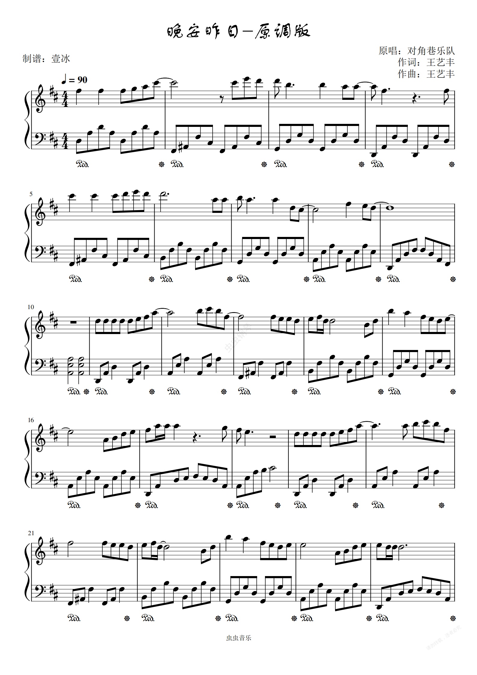 钢琴谱:晚安昨日//对角巷乐队-原调版