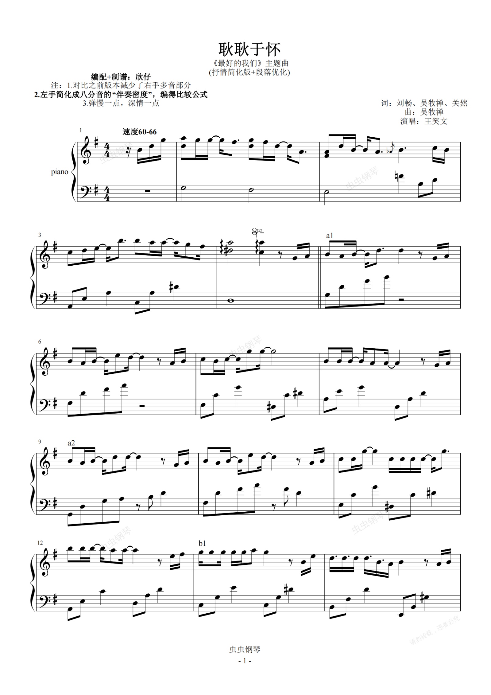 钢琴谱:重制简易版-王笑文-G《耿耿于怀》(《最好的我们》主题曲、段落优化)