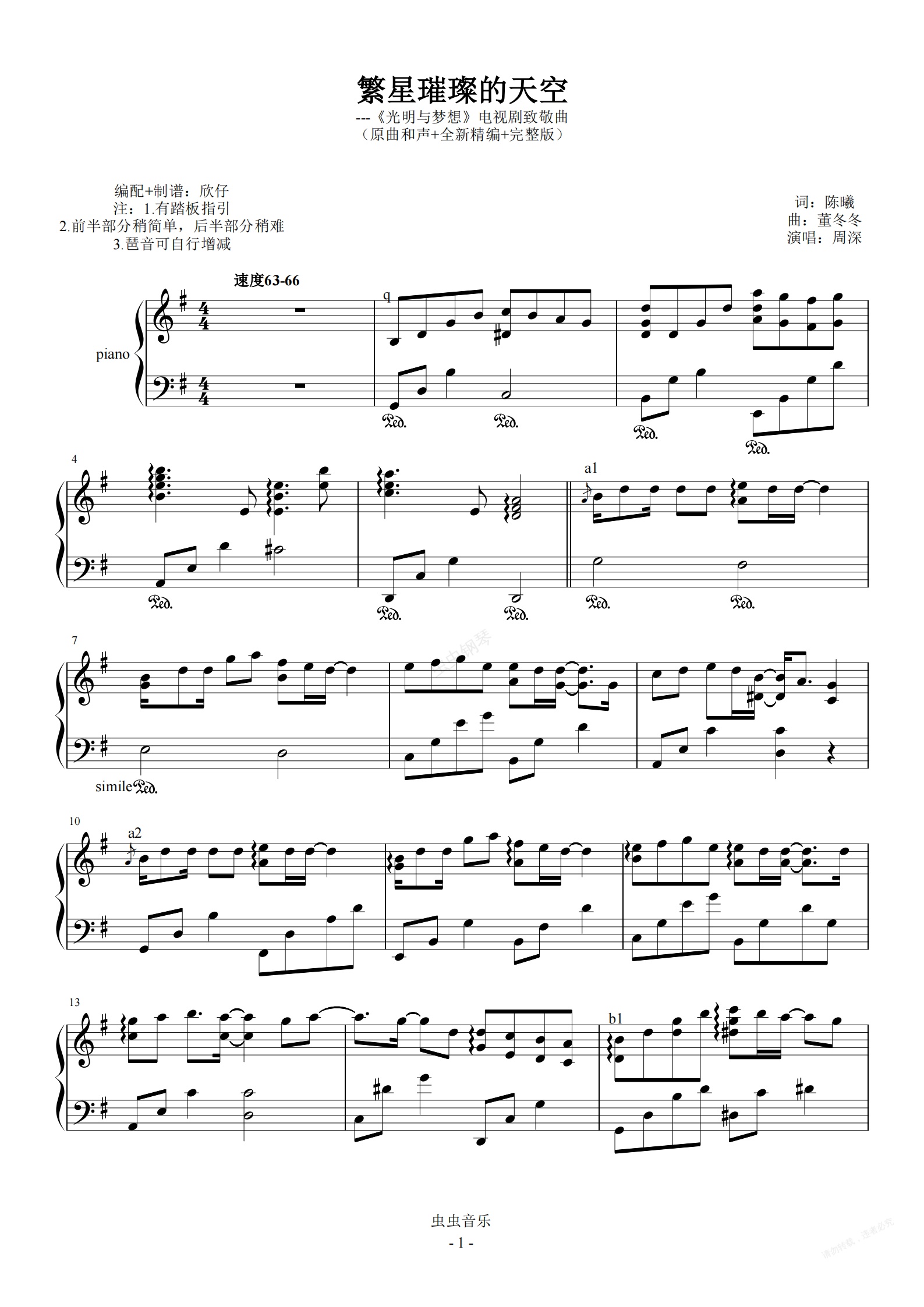 钢琴谱:周深-G《繁星璀璨的天空》(《光荣与梦想》致敬曲、全新精编+完整版)