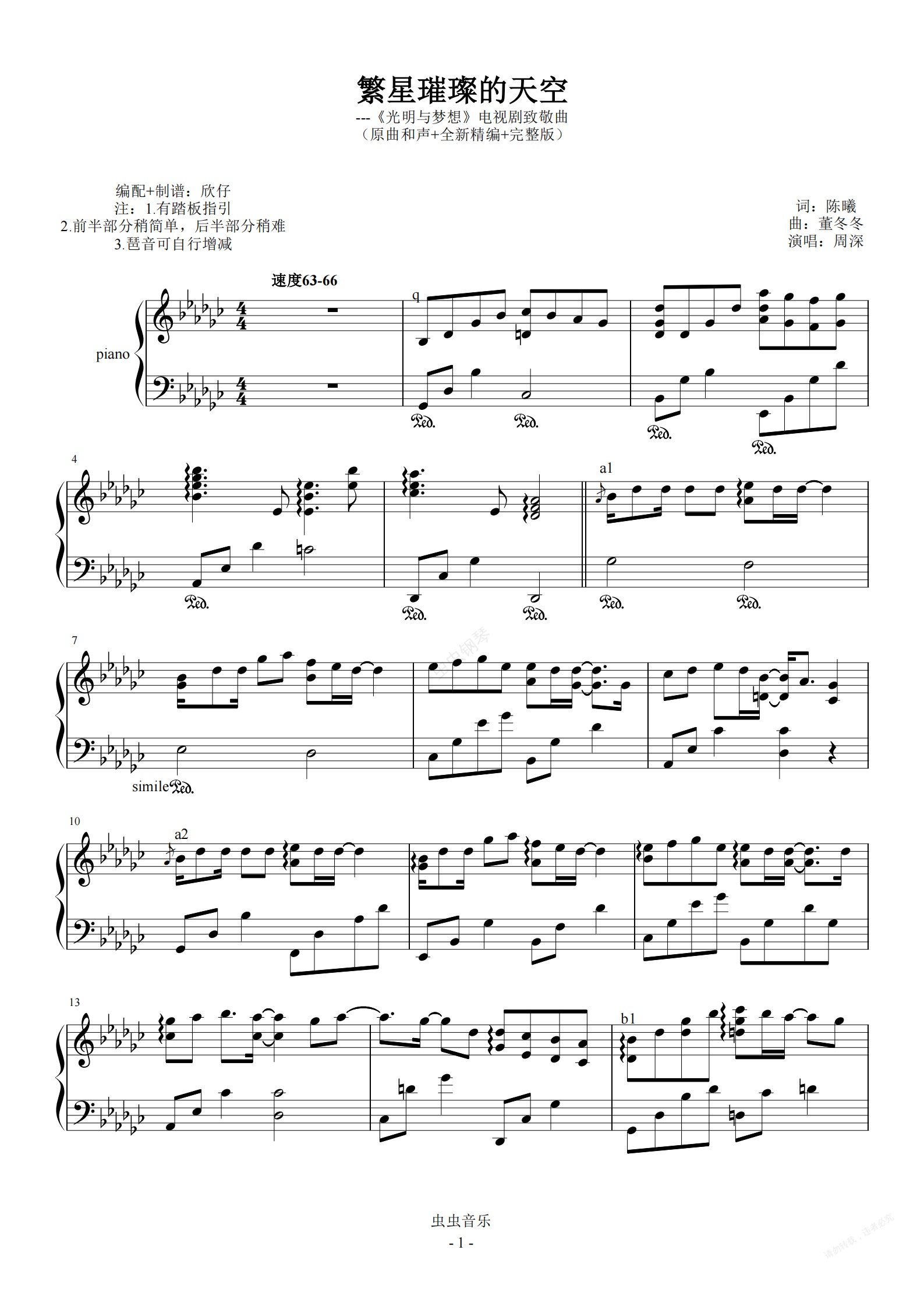 钢琴谱:周深-升F《繁星璀璨的天空》(《光荣与梦想》致敬曲、全新精编+完整版)
