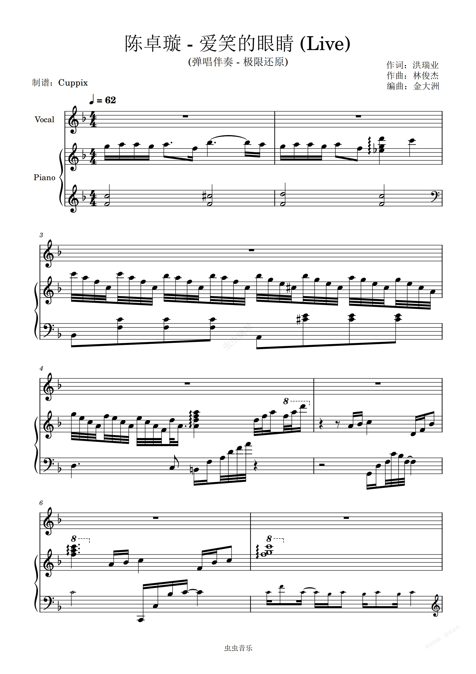 钢琴谱:陈卓璇《爱笑的眼睛》弹唱伴奏附词 极限还原(硬糖少女303)