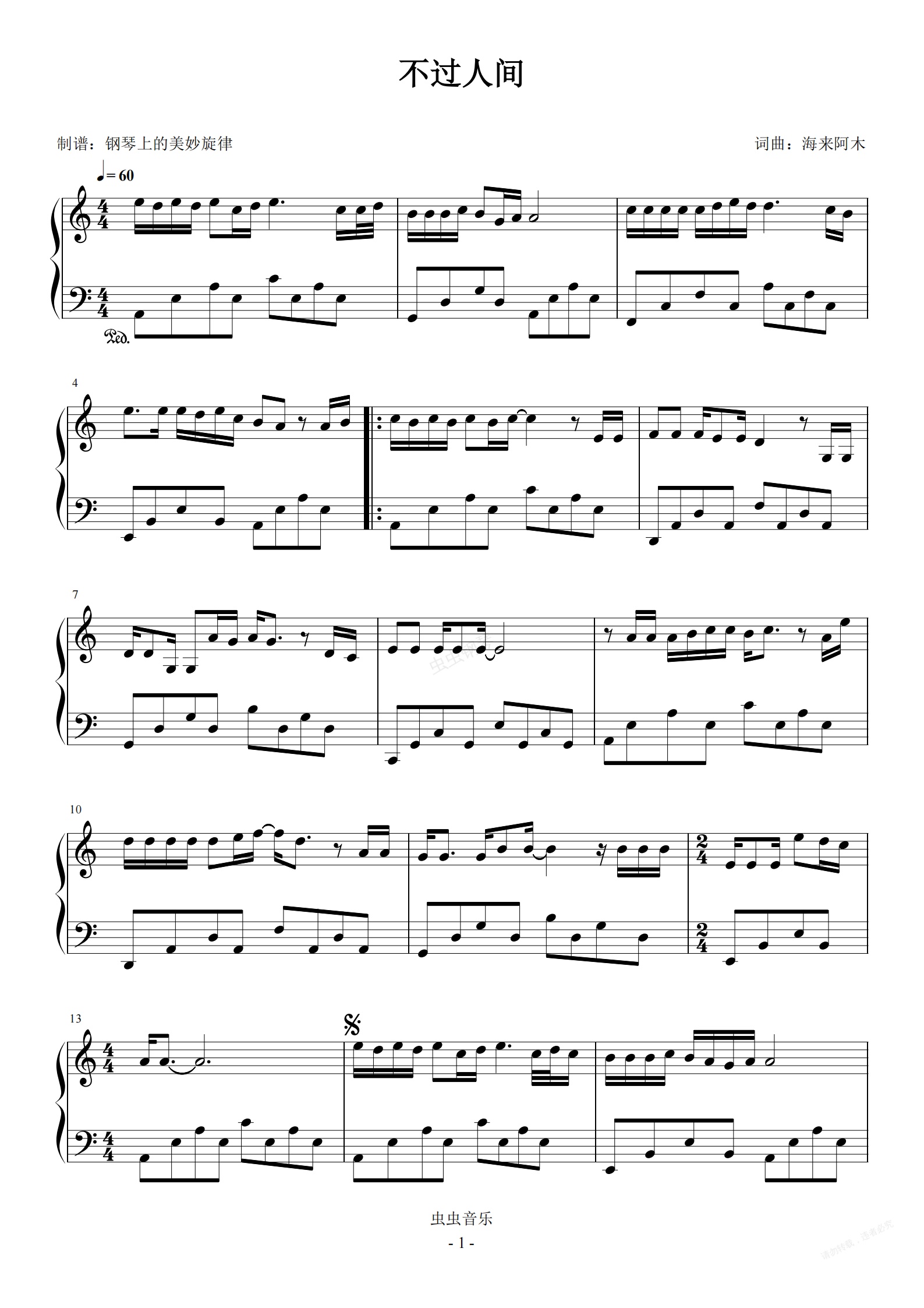 钢琴谱:不过人间(月亮月亮你别睡) C调简易版 海来阿木