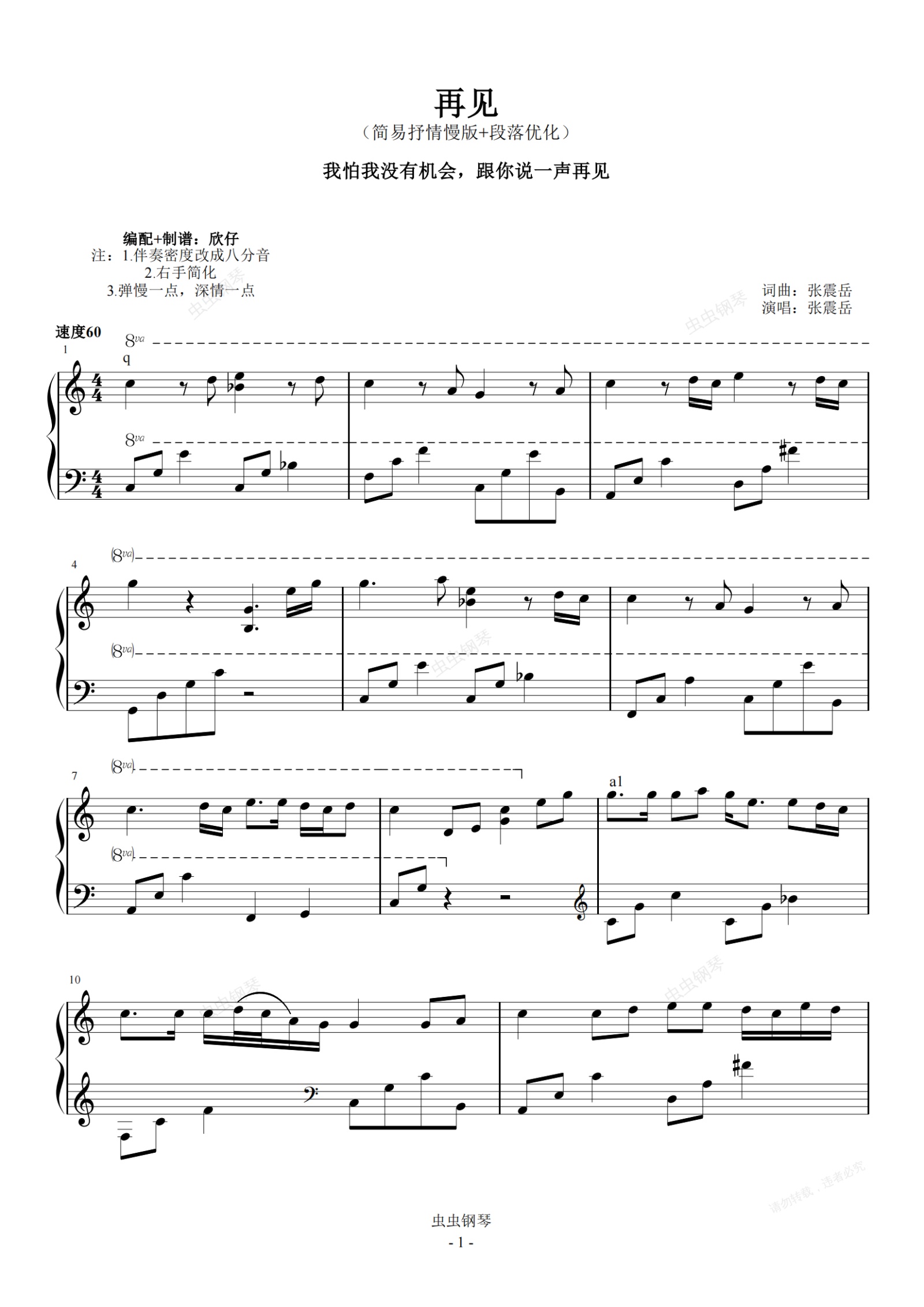 钢琴谱:张震岳-C《再见》(简易抒情版+段落优化)
