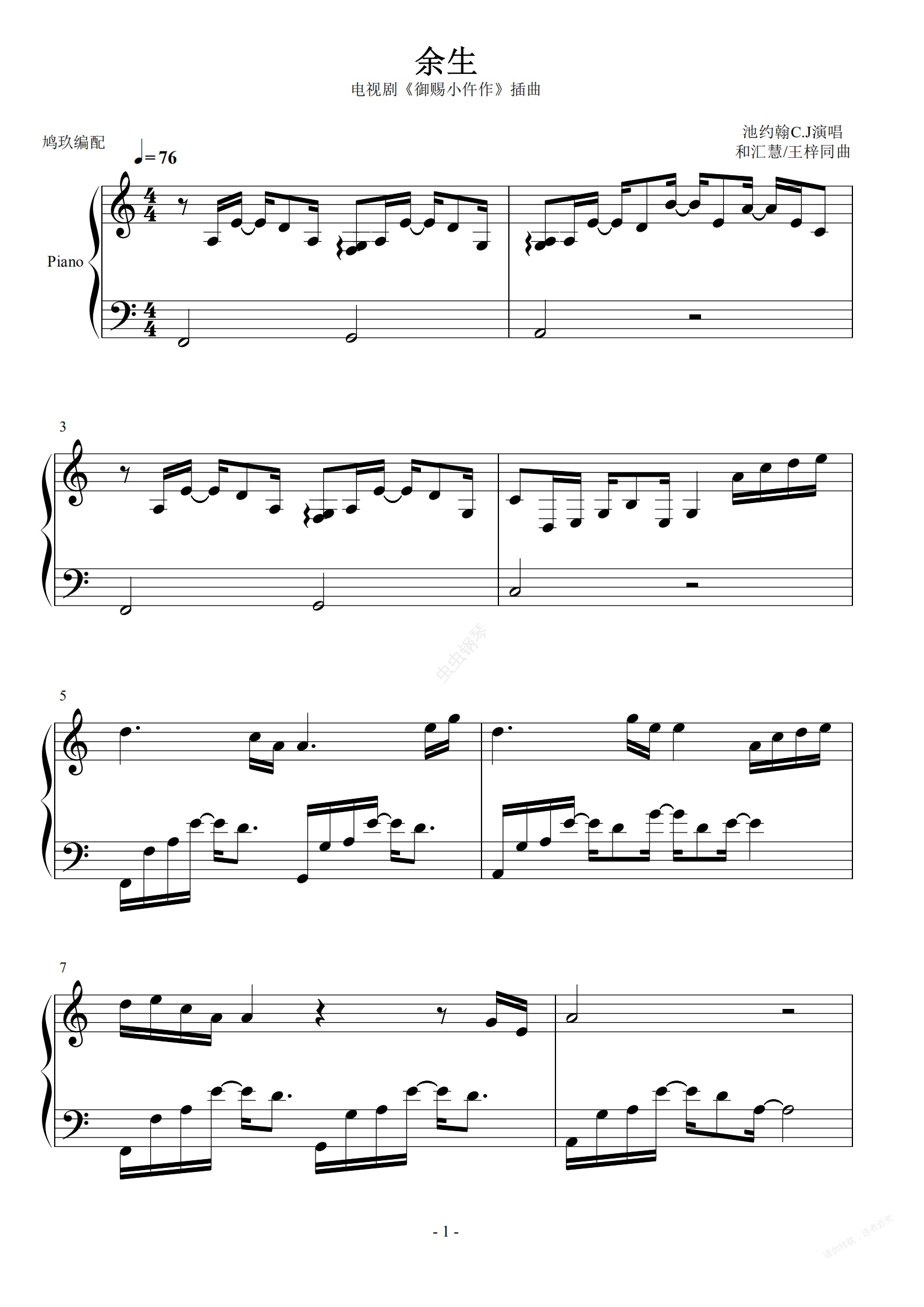 钢琴谱:余生(电视剧《御赐小仵作》插曲)C调简易版