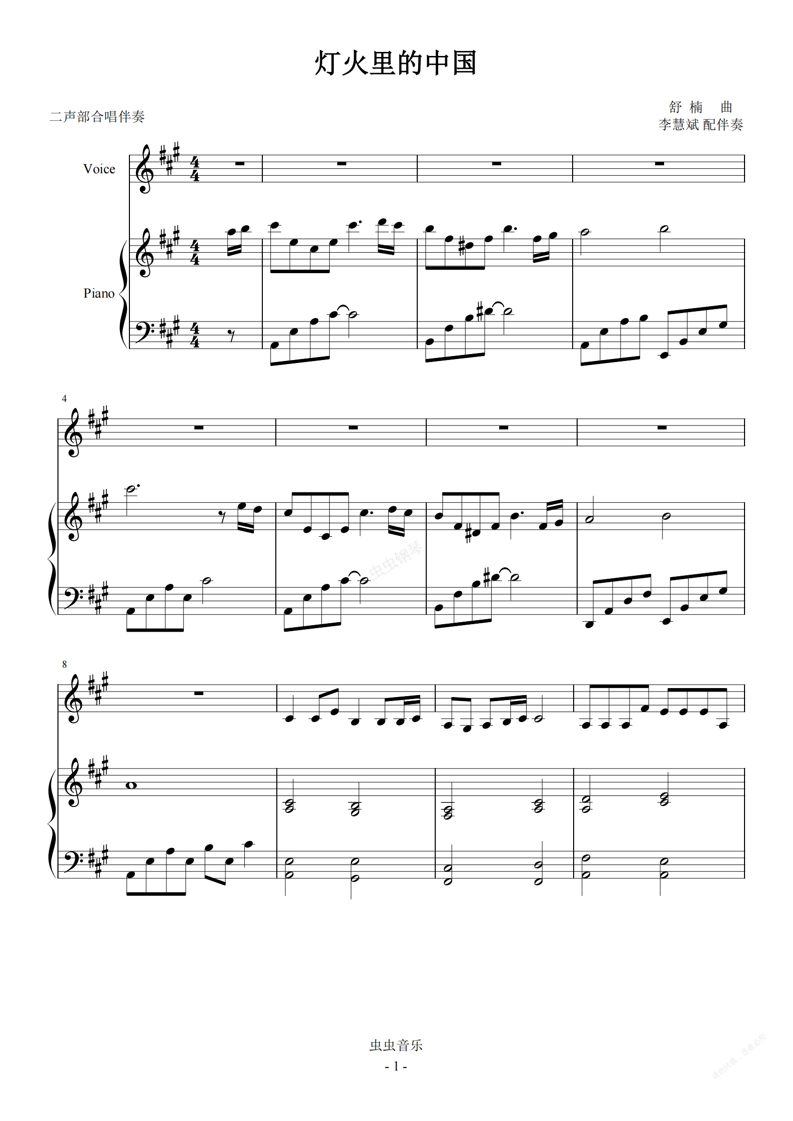 钢琴谱:灯火里的中国 A(二声部合唱钢伴)