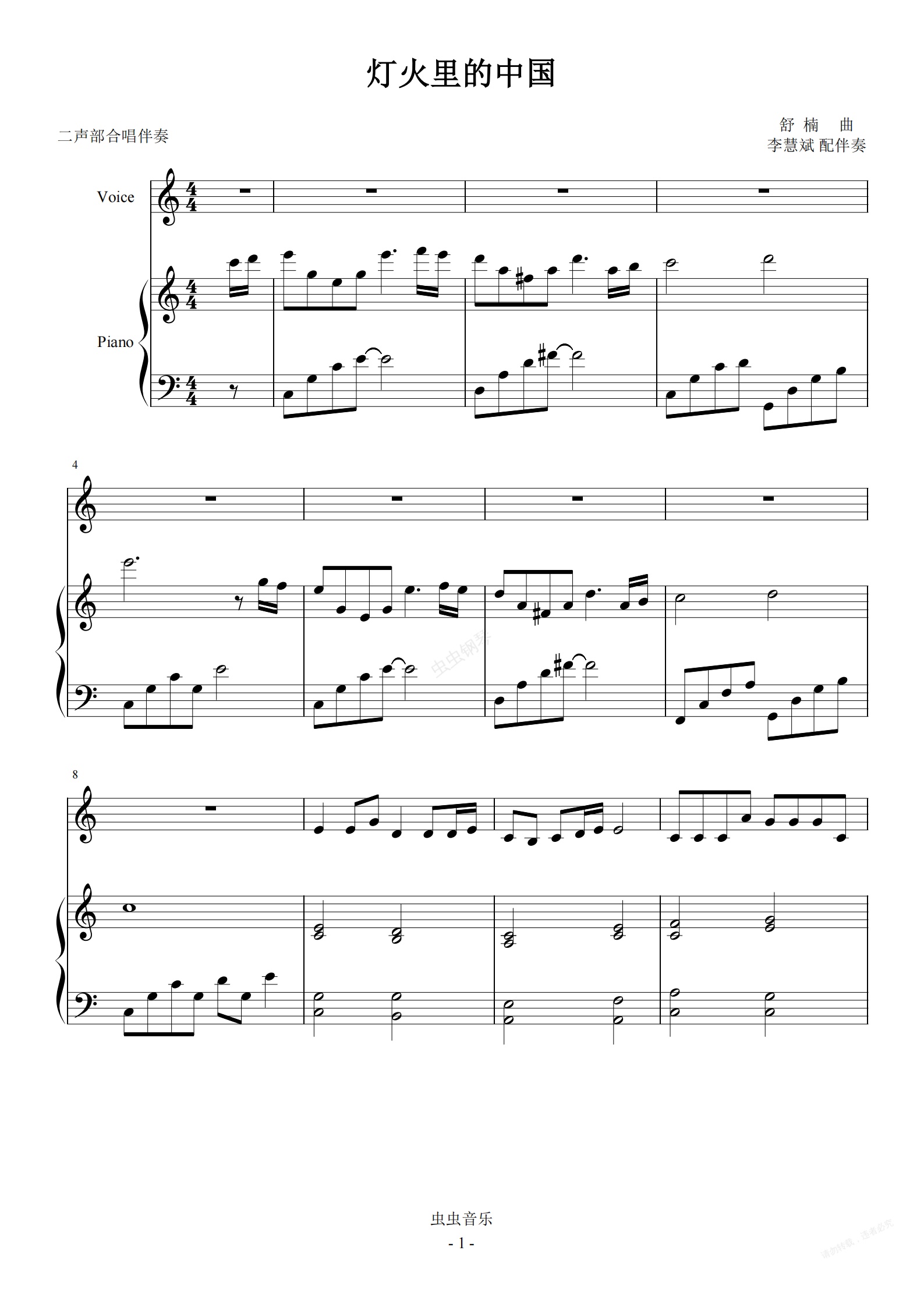 钢琴谱:灯火里的中国C(二声部合唱钢伴)