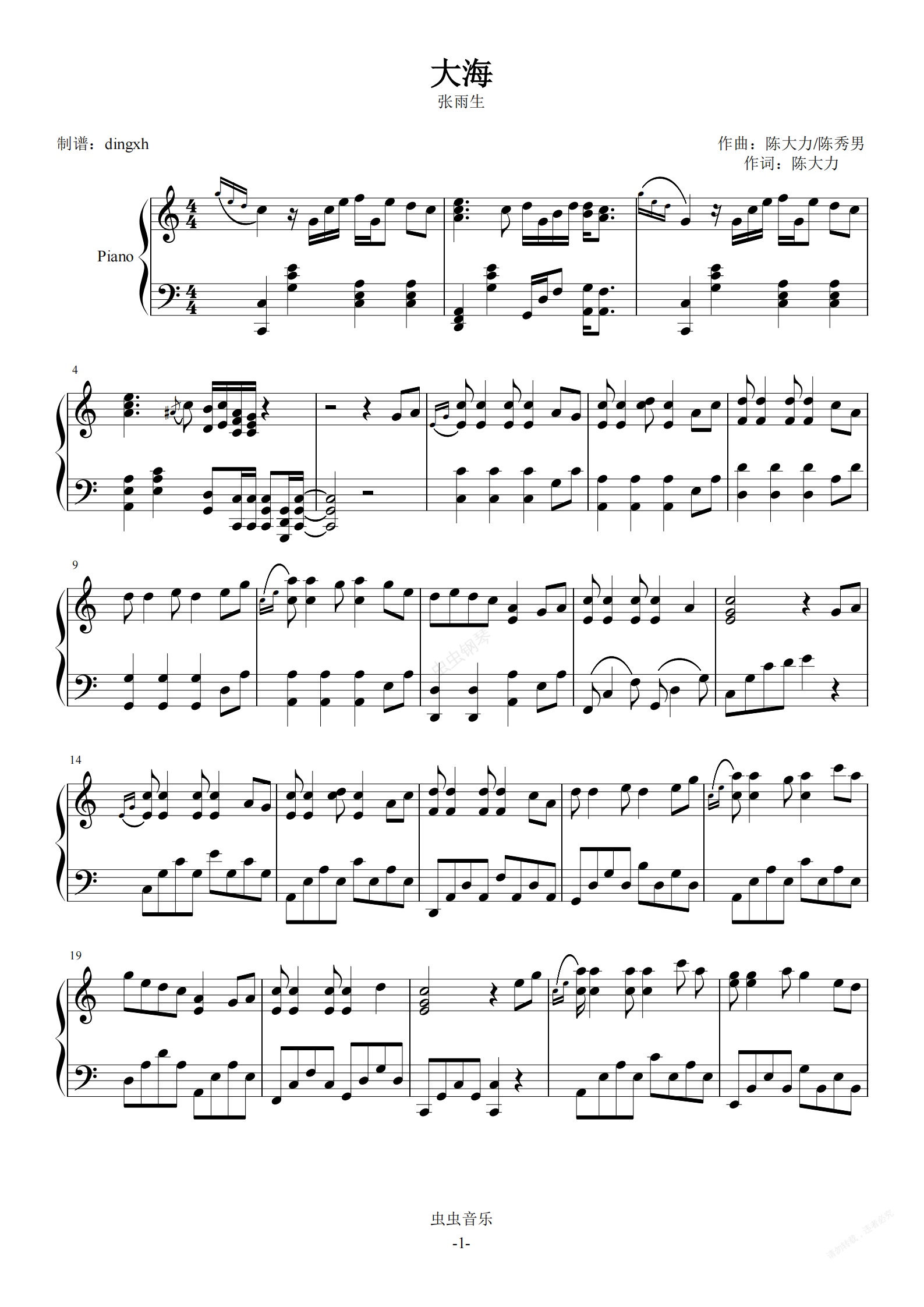 钢琴谱:大海-张雨生-IN C