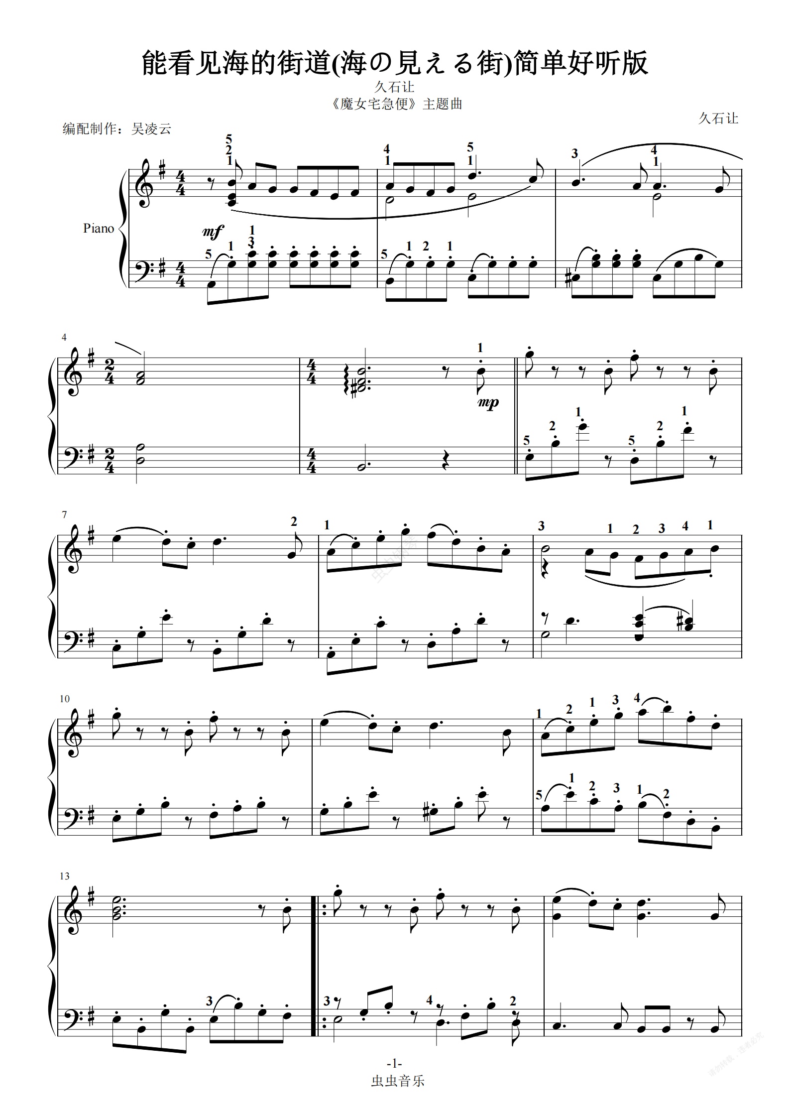 钢琴谱:能看见海的街道(海の見える街)久石让 带指法 简单好听 《魔女宅急便》主题曲 吴凌云编配制作钢琴独奏