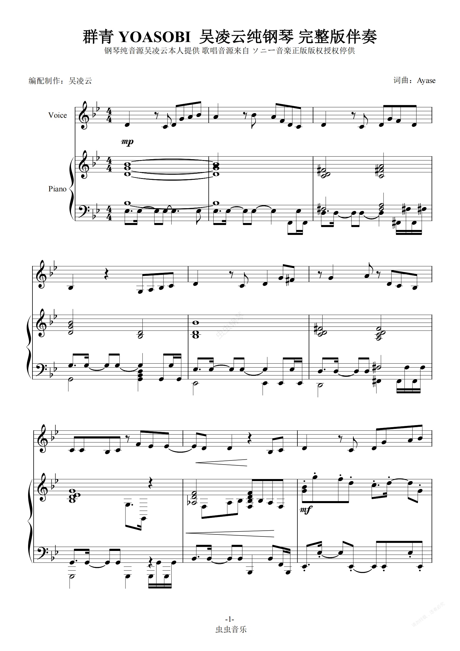 钢琴谱:群青 YOASOBI 吴凌云纯钢琴完整伴奏