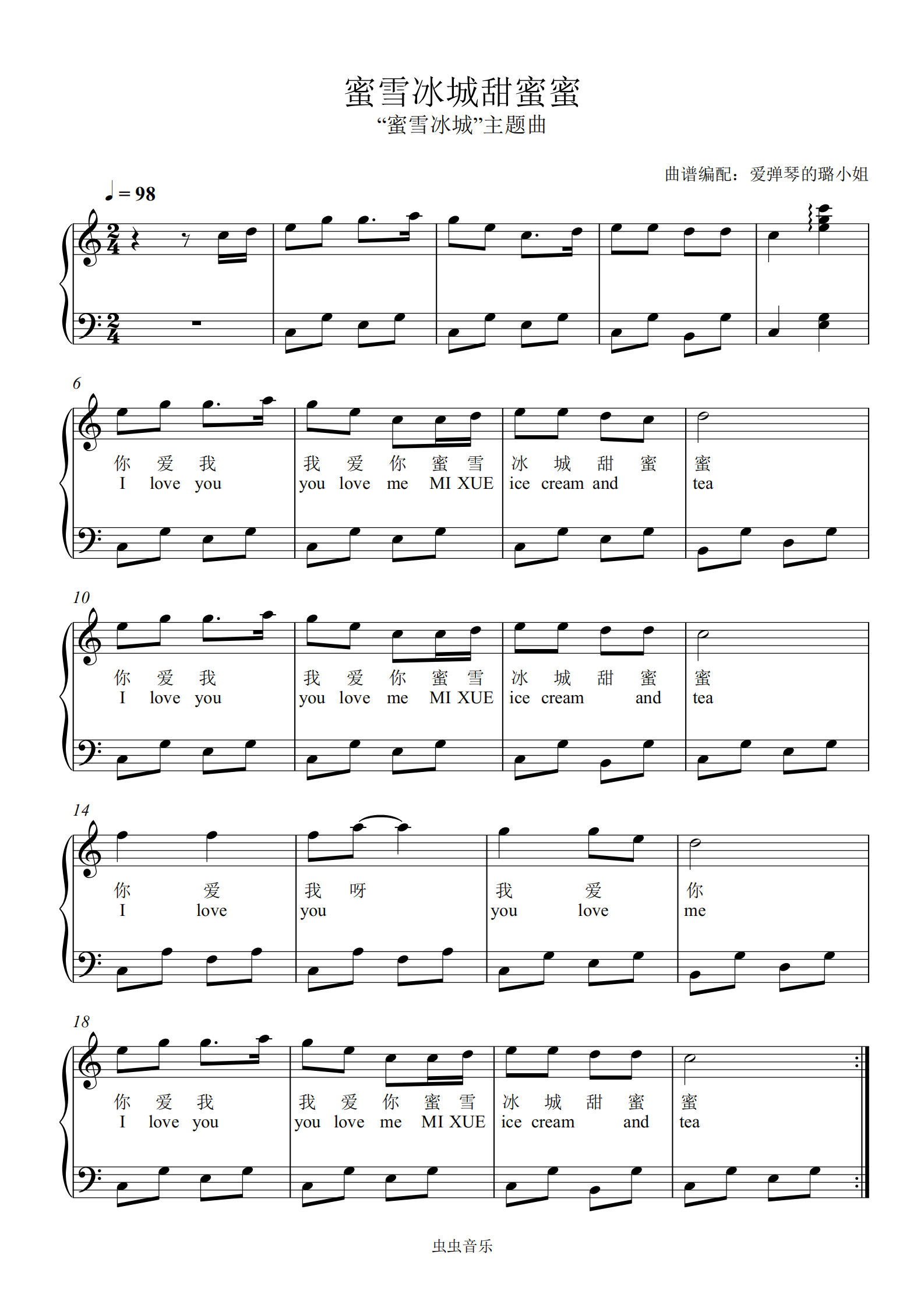 钢琴谱:蜜雪冰城甜蜜蜜 - 抖音爆火神曲 - C调附歌词简单版