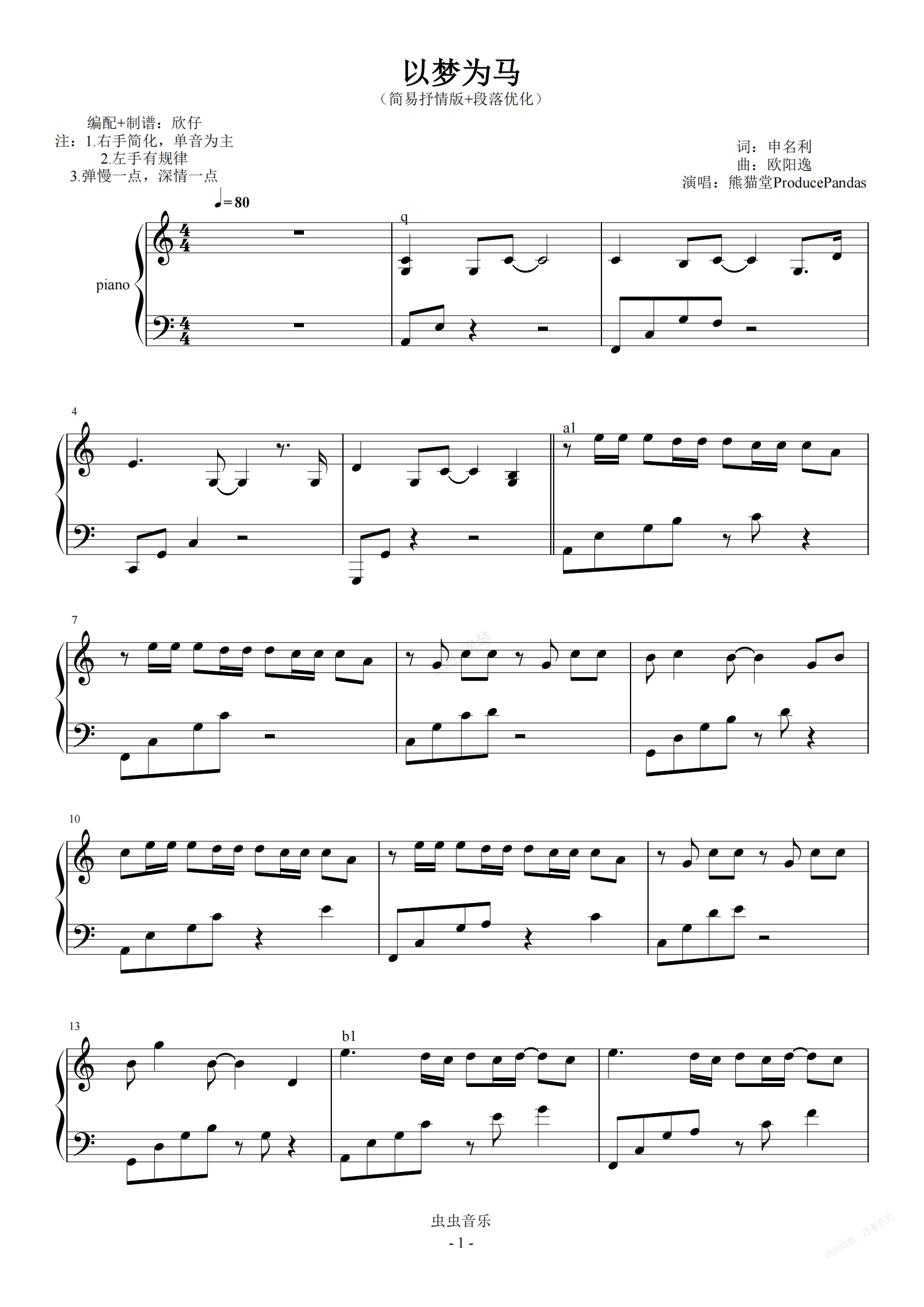 钢琴谱:熊猫堂-C《以梦为马》(简易抒情版+段落优化)