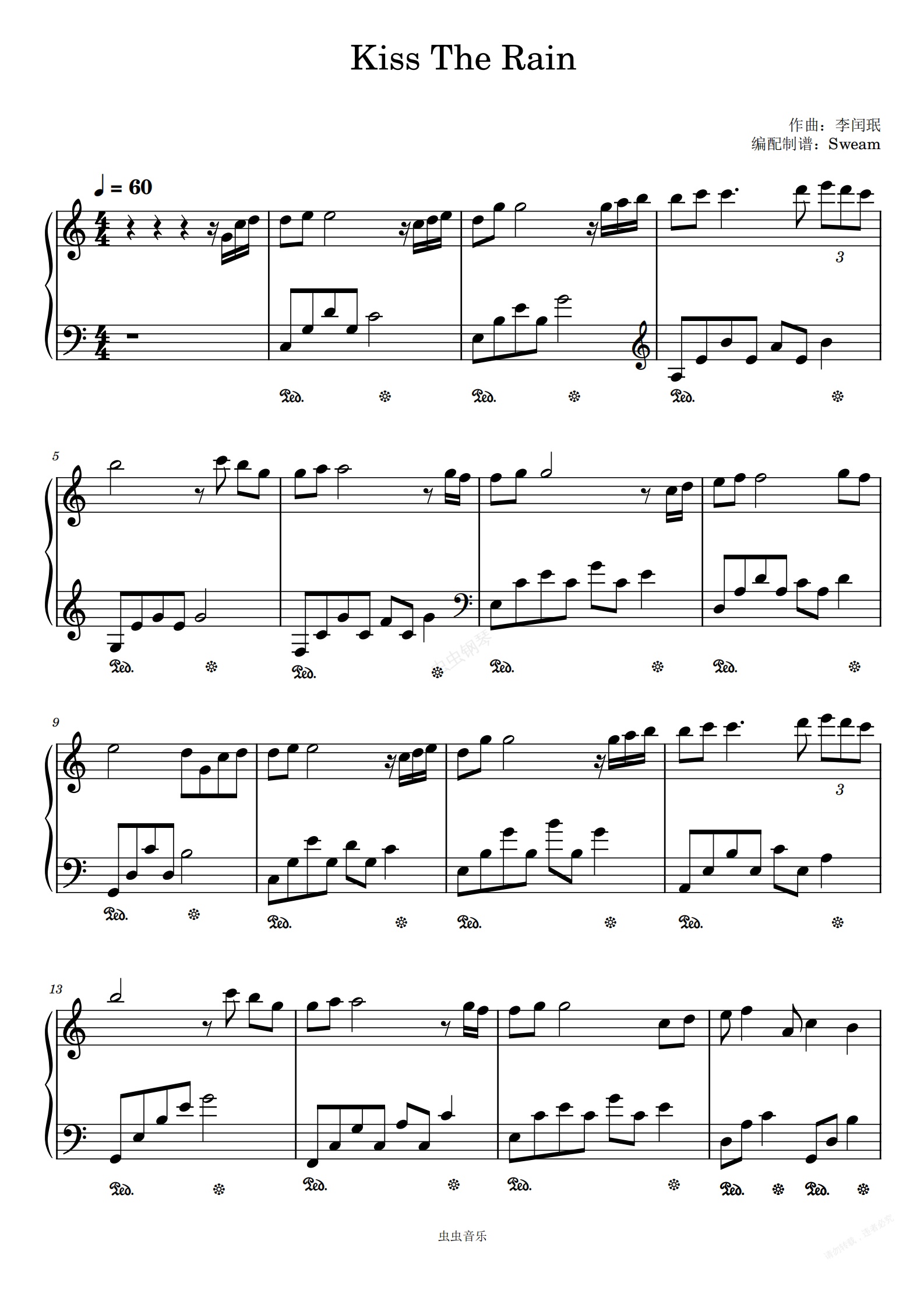 钢琴谱:Kiss the rain(精编C调小白入门简单版)