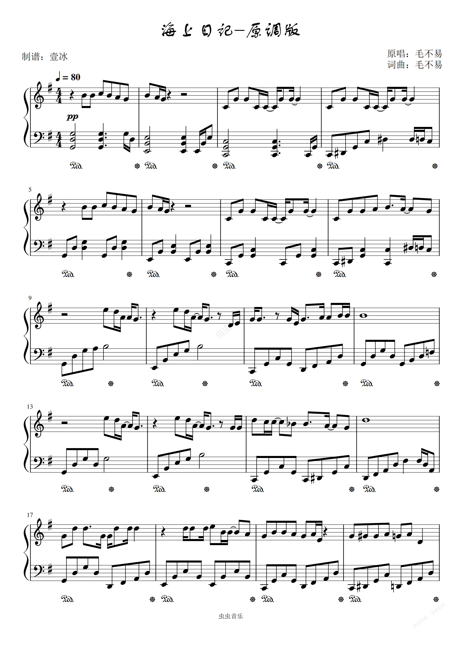 钢琴谱:海上日记//毛不易-原调版