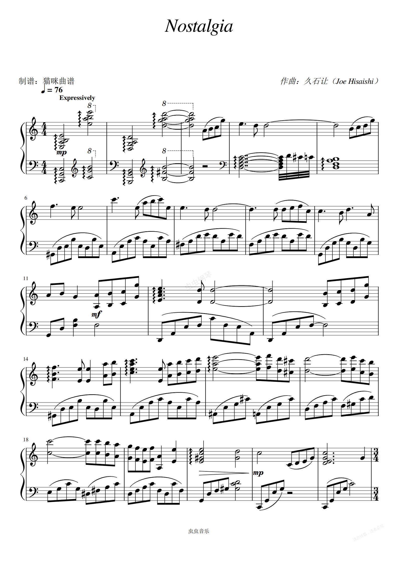 钢琴谱:Nostalgia(久石让)