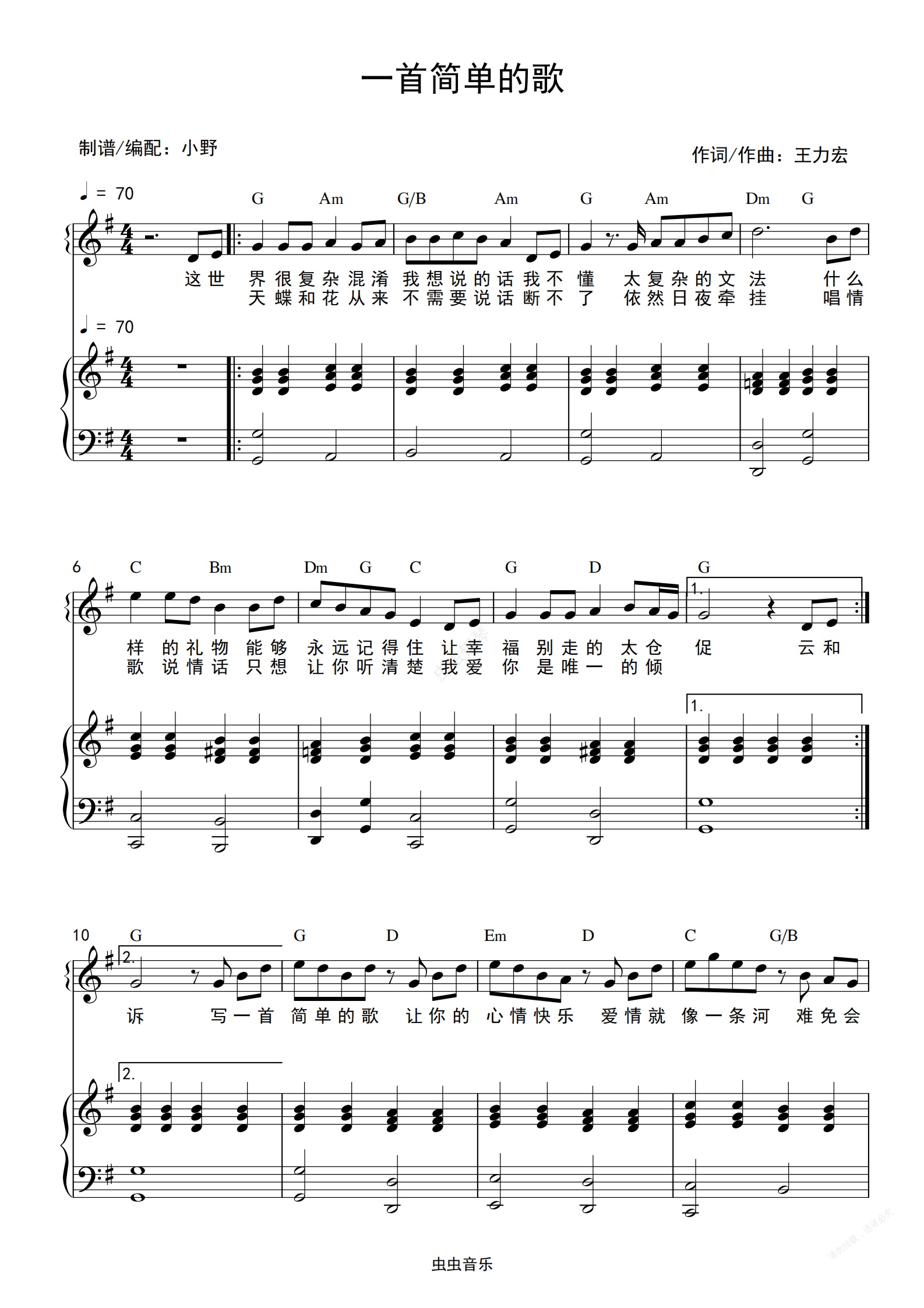 钢琴谱:一首简单的歌(和弦弹唱版)