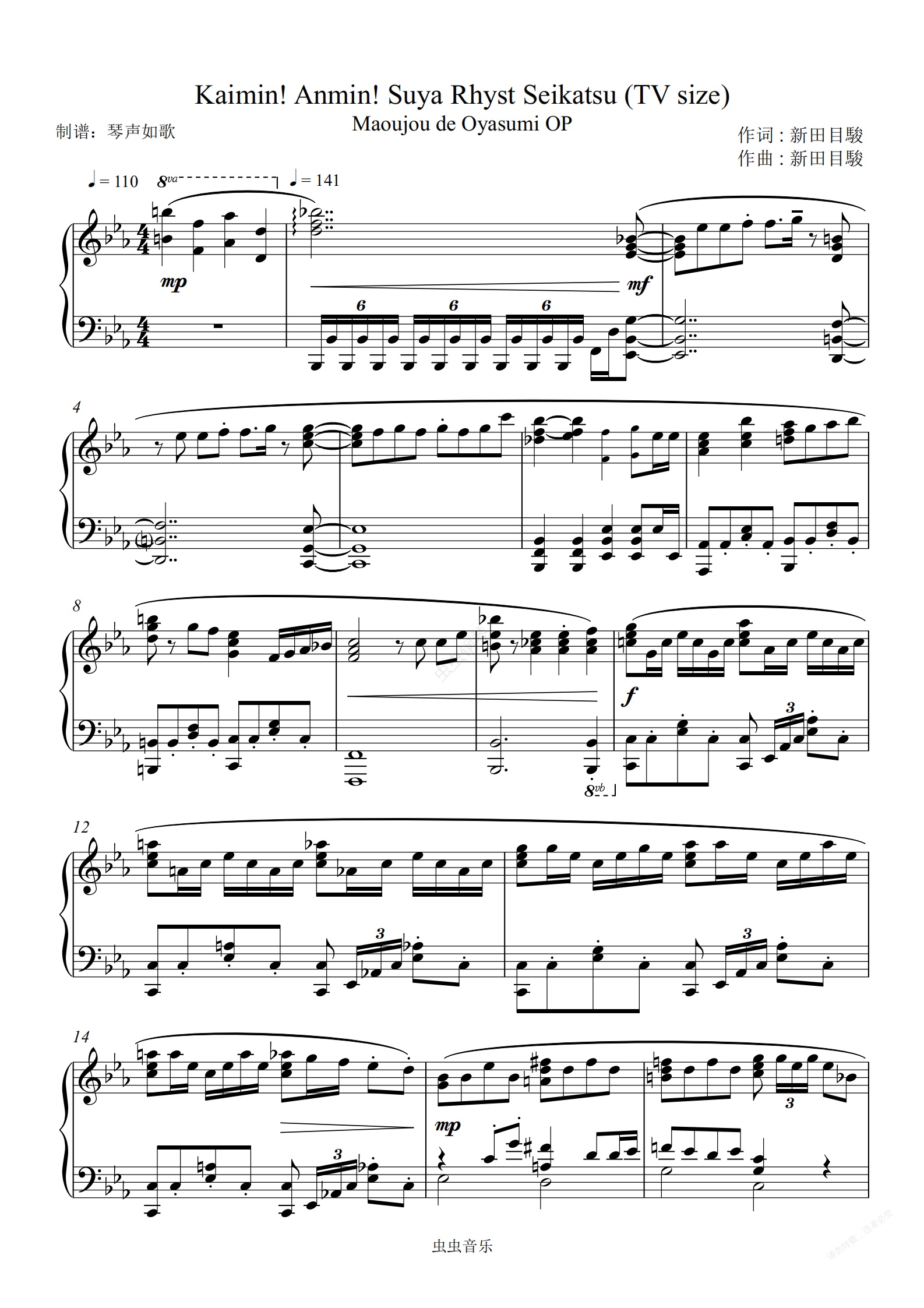 钢琴谱:快眠! 安眠! スヤリスト生活 【TV动画在魔王城插曲】