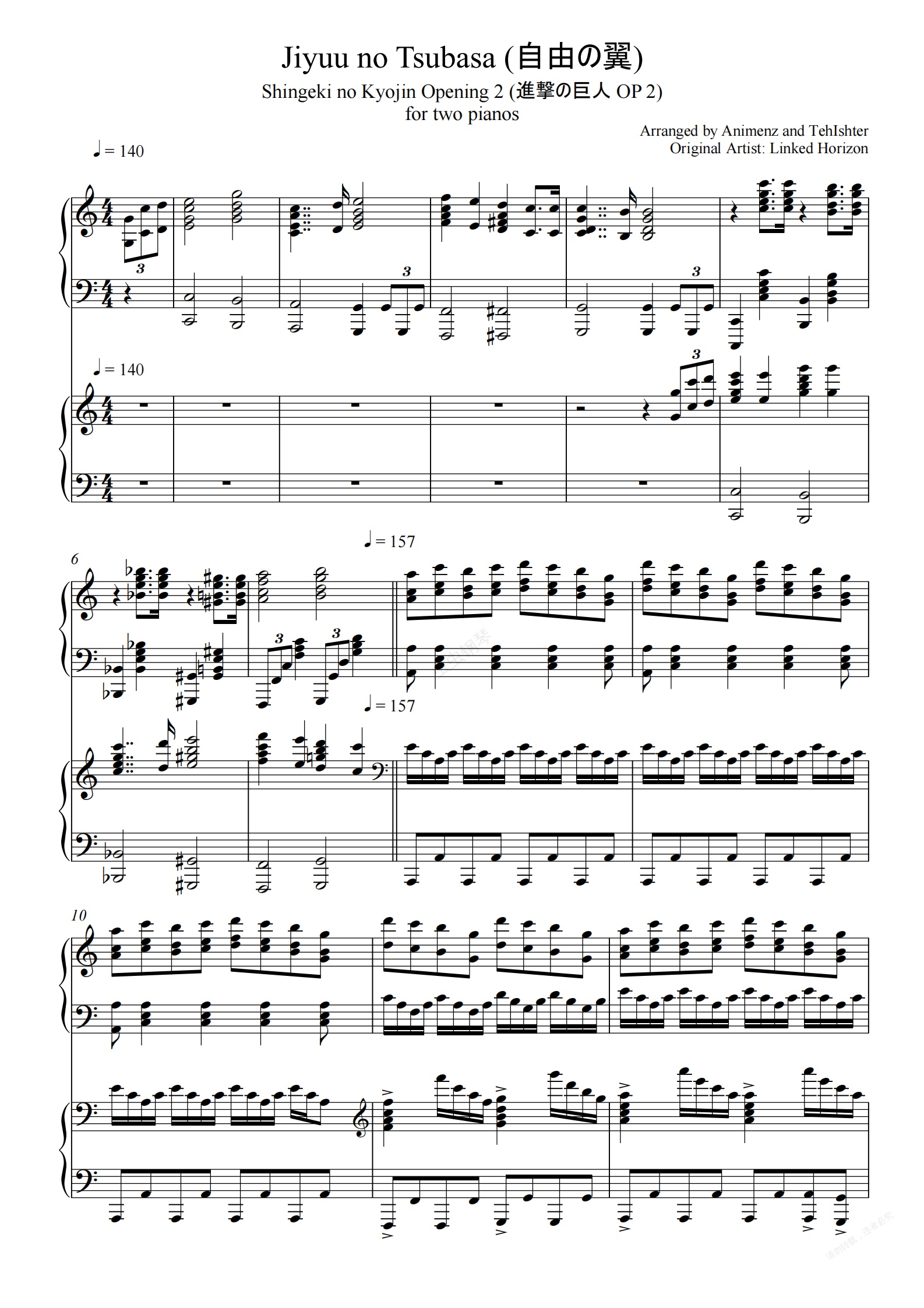 钢琴谱:自由之翼-进击的巨人 (A叔T叔双钢琴版)