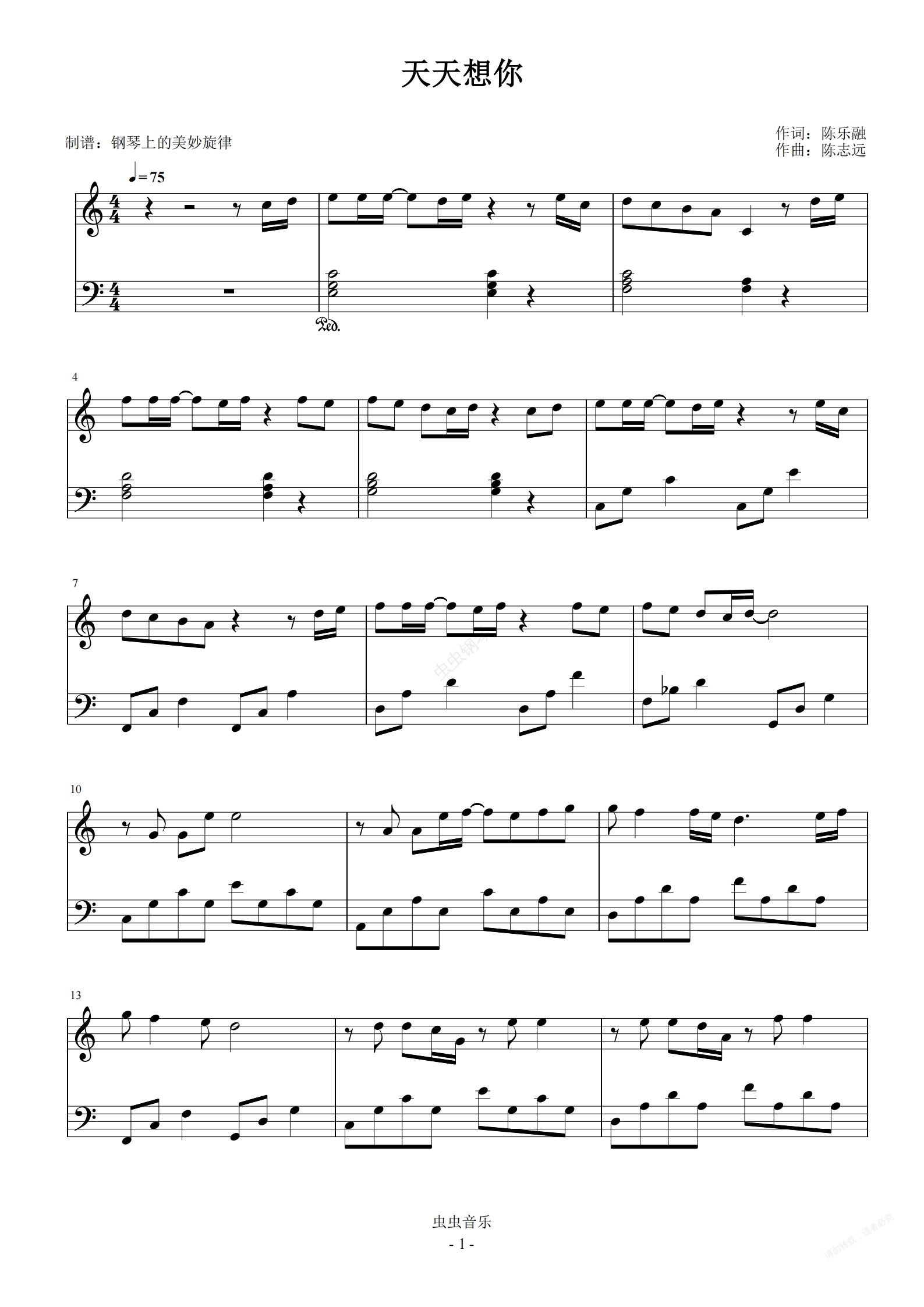 钢琴谱:天天想你 C调简易版 张雨生 流行经典