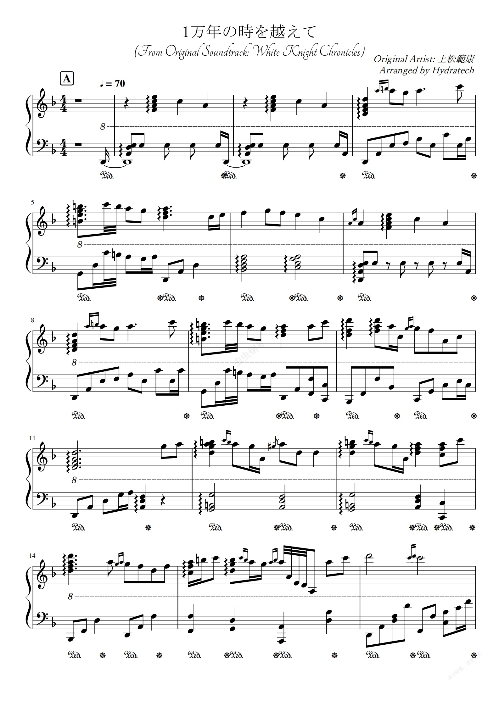 《白骑士物语》()主题曲《一万年の时を越えて》。听一下原曲就知道是一首非常有世纪初日式RPG情调的三声部民谣抒情,负责主旋律的是吹奏乐萧(大概是萧吧,我不太会分辨乐器,不是木管族,更像东方乐器),这种音色略带嘶哑、穿透力强、滑音抹音装饰音巨多的吹奏乐就很难用钢琴音色模仿出来;负责低音旋律伴奏类似于流行乐贝斯角色的是木琴或者马林巴一类的乐器;然后负责拿琶音填充及装饰旋律的是曼陀林或者柳琴一类的乐器,这种也很难模仿,因为弹钢琴就两只手,无论腾出来那只手都得适当牺牲本身的旋律线稳定或者是紧忙活加高难度。