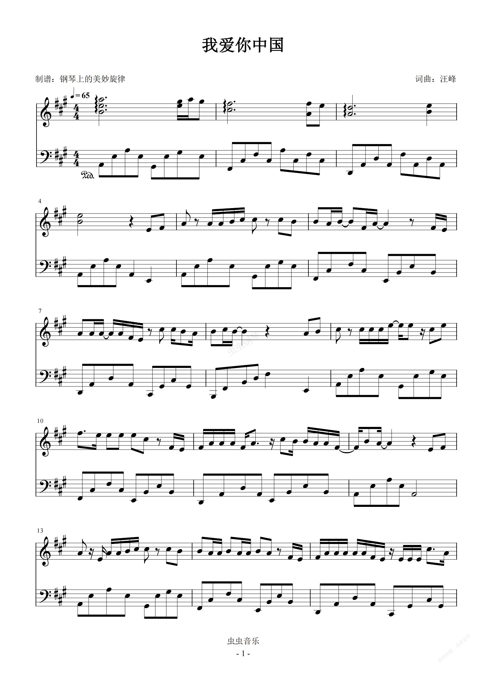 钢琴谱:我爱你中国 简易版 汪峰