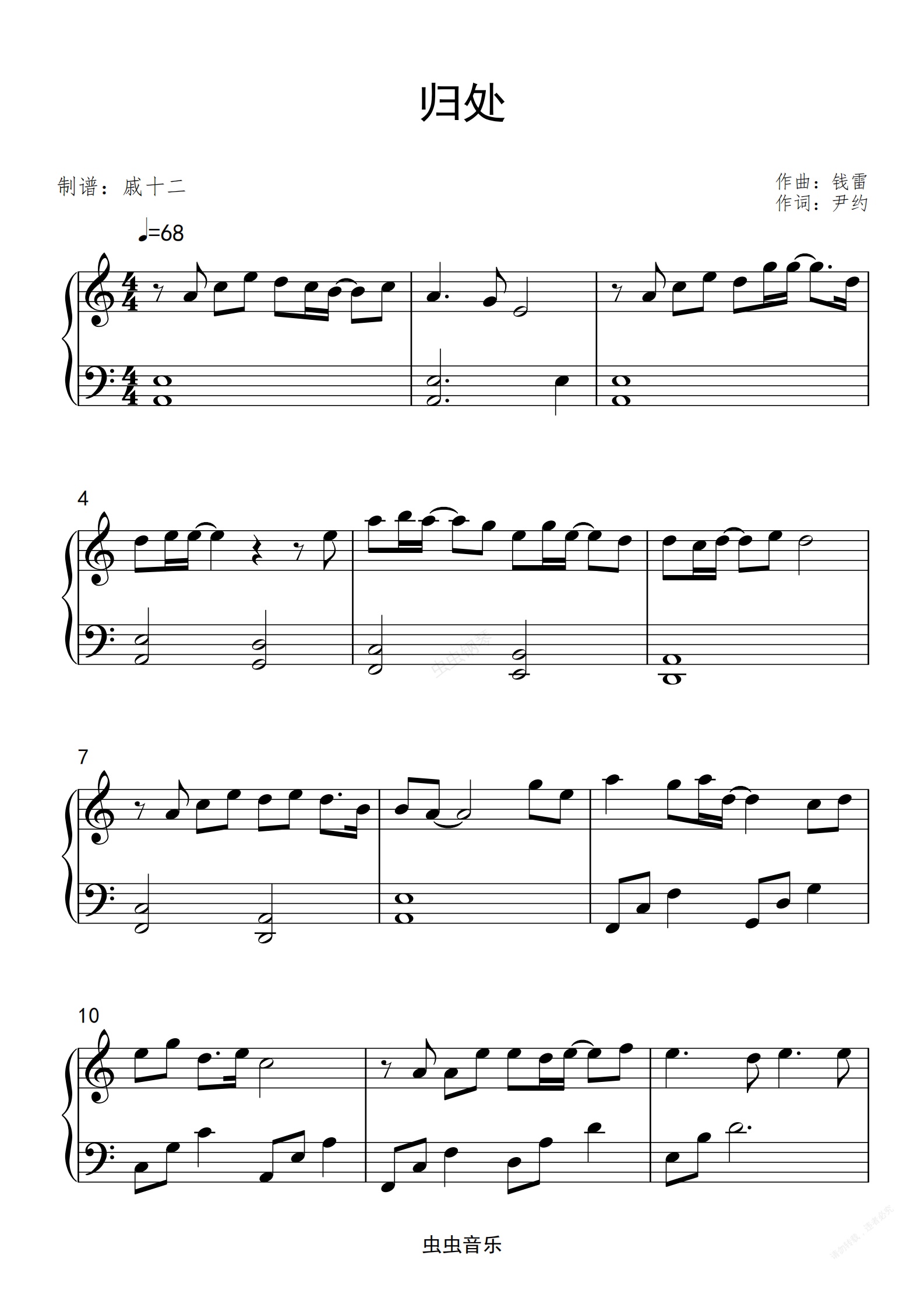 钢琴谱:归处《侍神令》电影主题曲-C调简单版