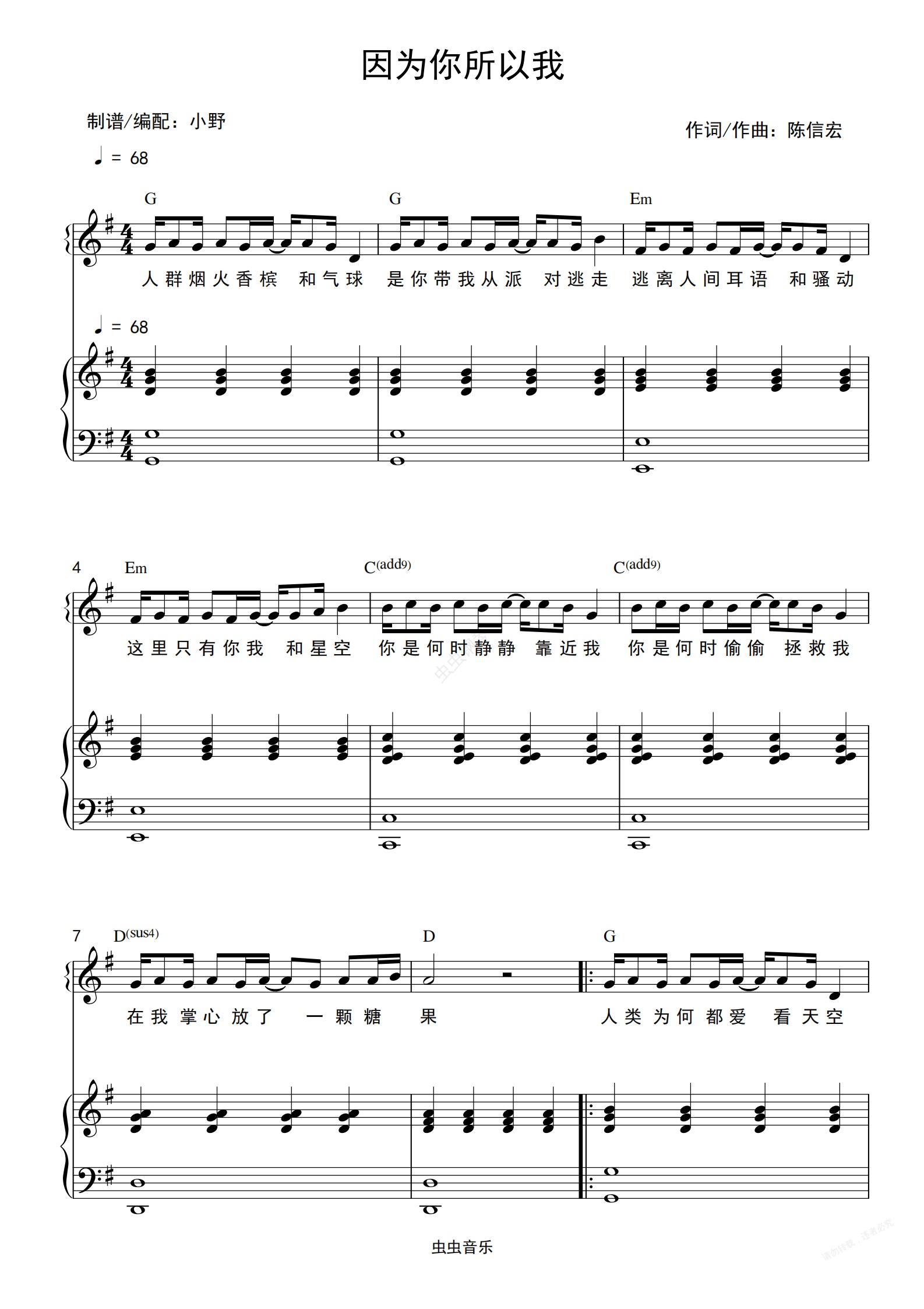 钢琴谱:因为你所以我(和弦弹唱版)