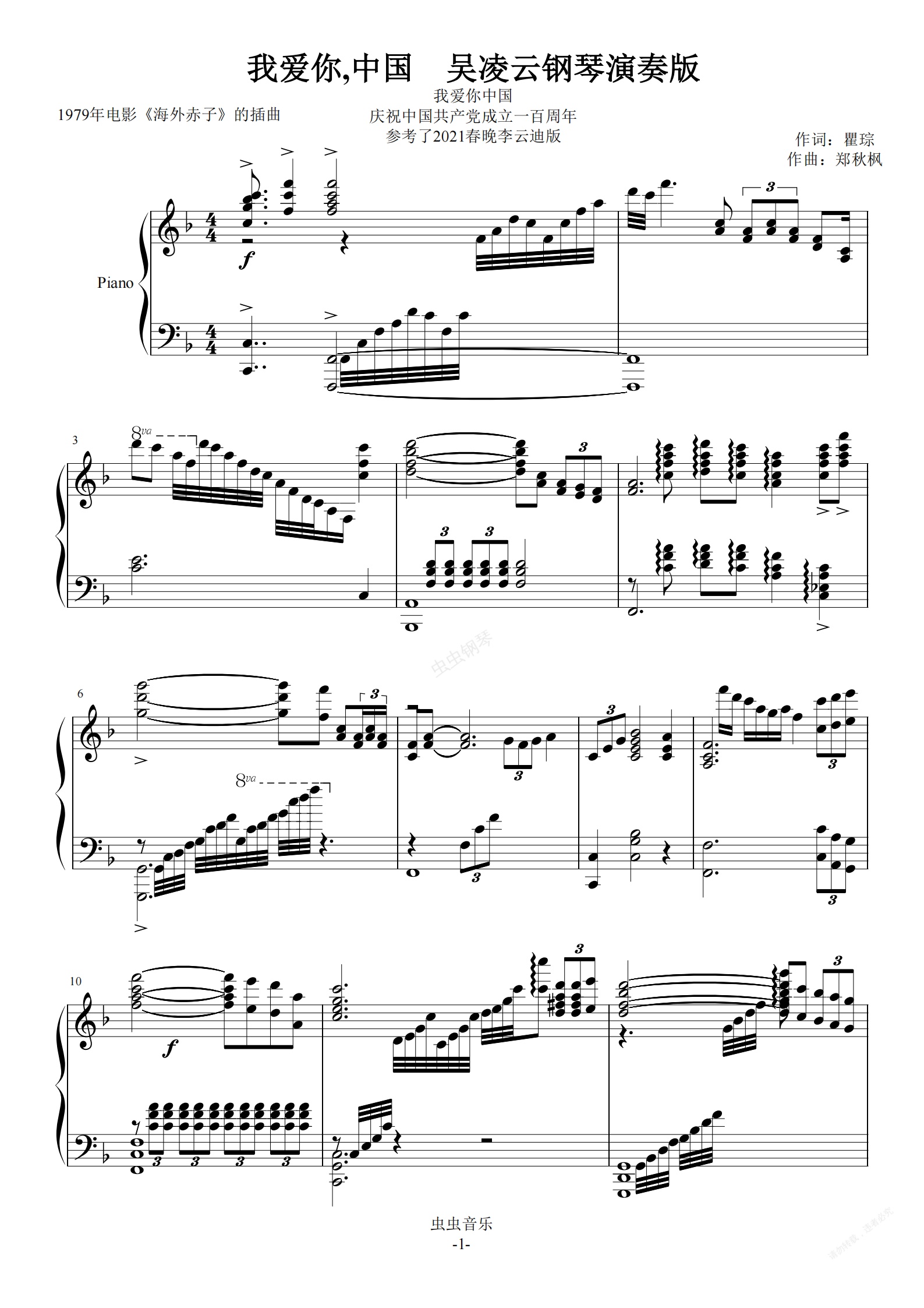 钢琴谱:我爱你,中国 《我爱你中国》 吴凌云钢琴演奏版 庆祝中国共产党成立一百周年 参考了2021春晚李云迪版