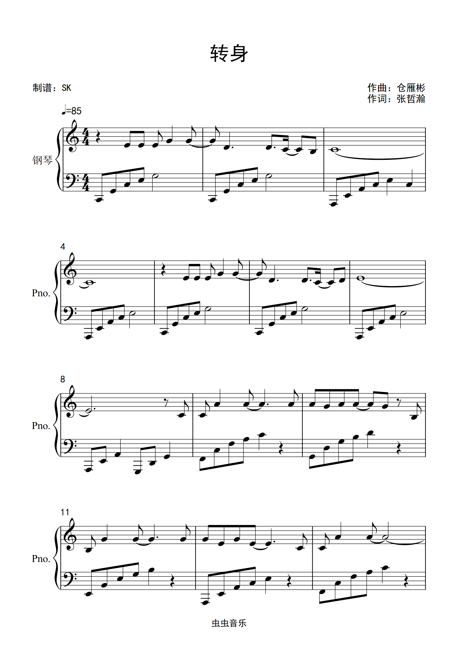 钢琴谱:张哲瀚《转身》入门C调简单版