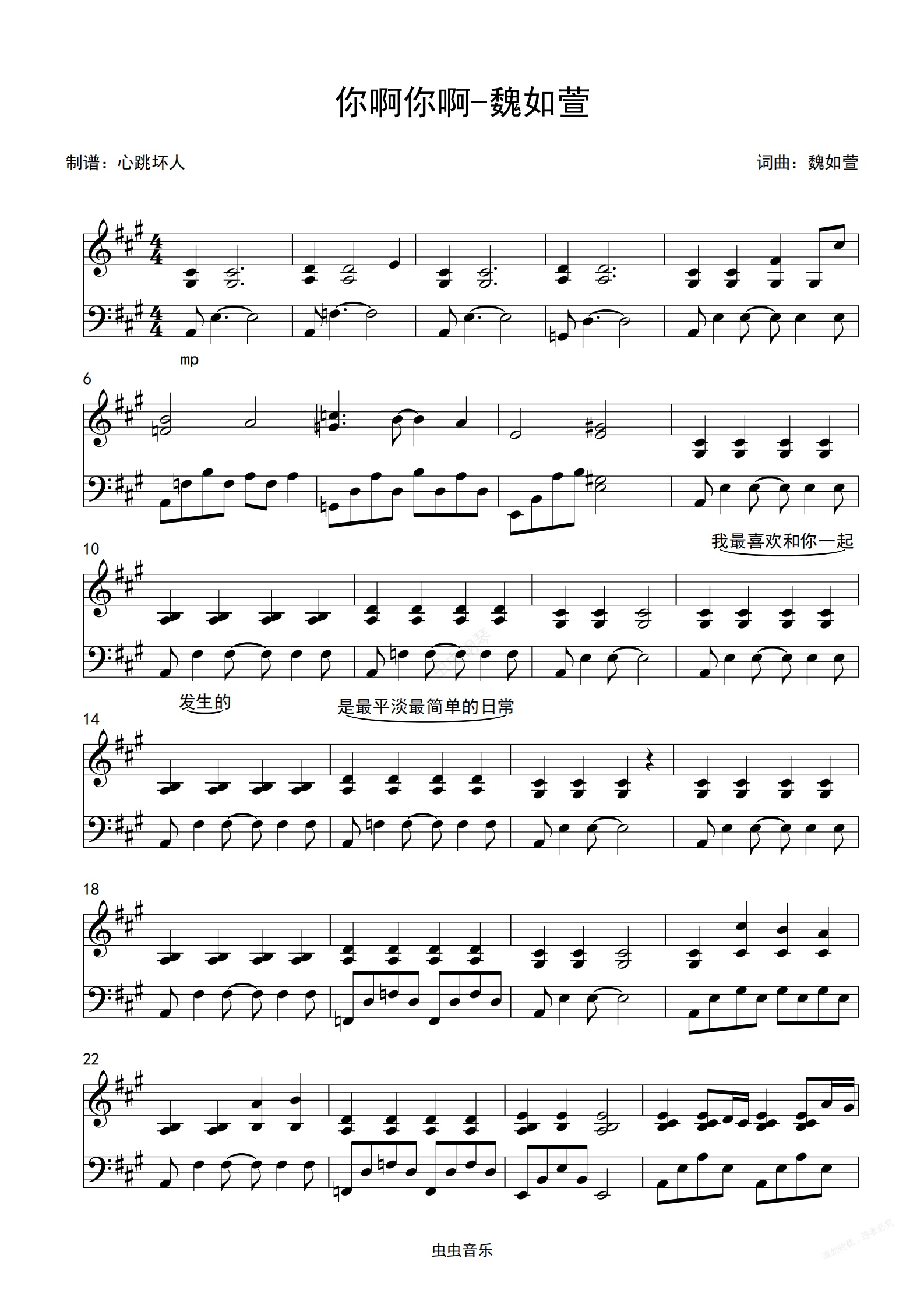 钢琴谱:你啊你啊【A大调钢琴弹唱版】-魏如萱超好听歌曲