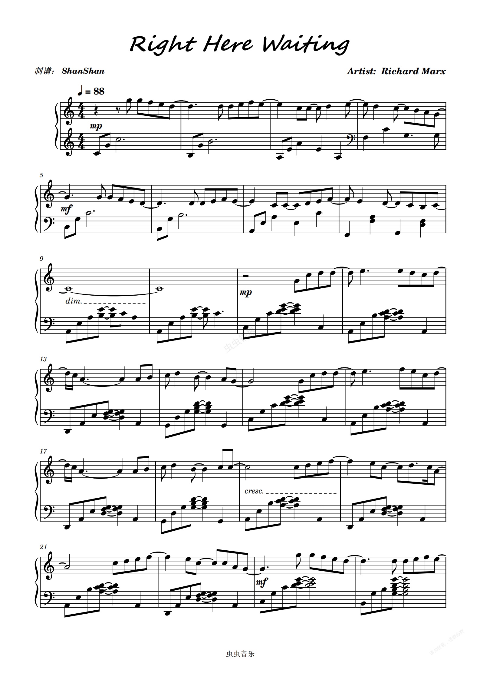 钢琴谱:Right Here waiting 独奏钢琴谱 (指法流畅版)
