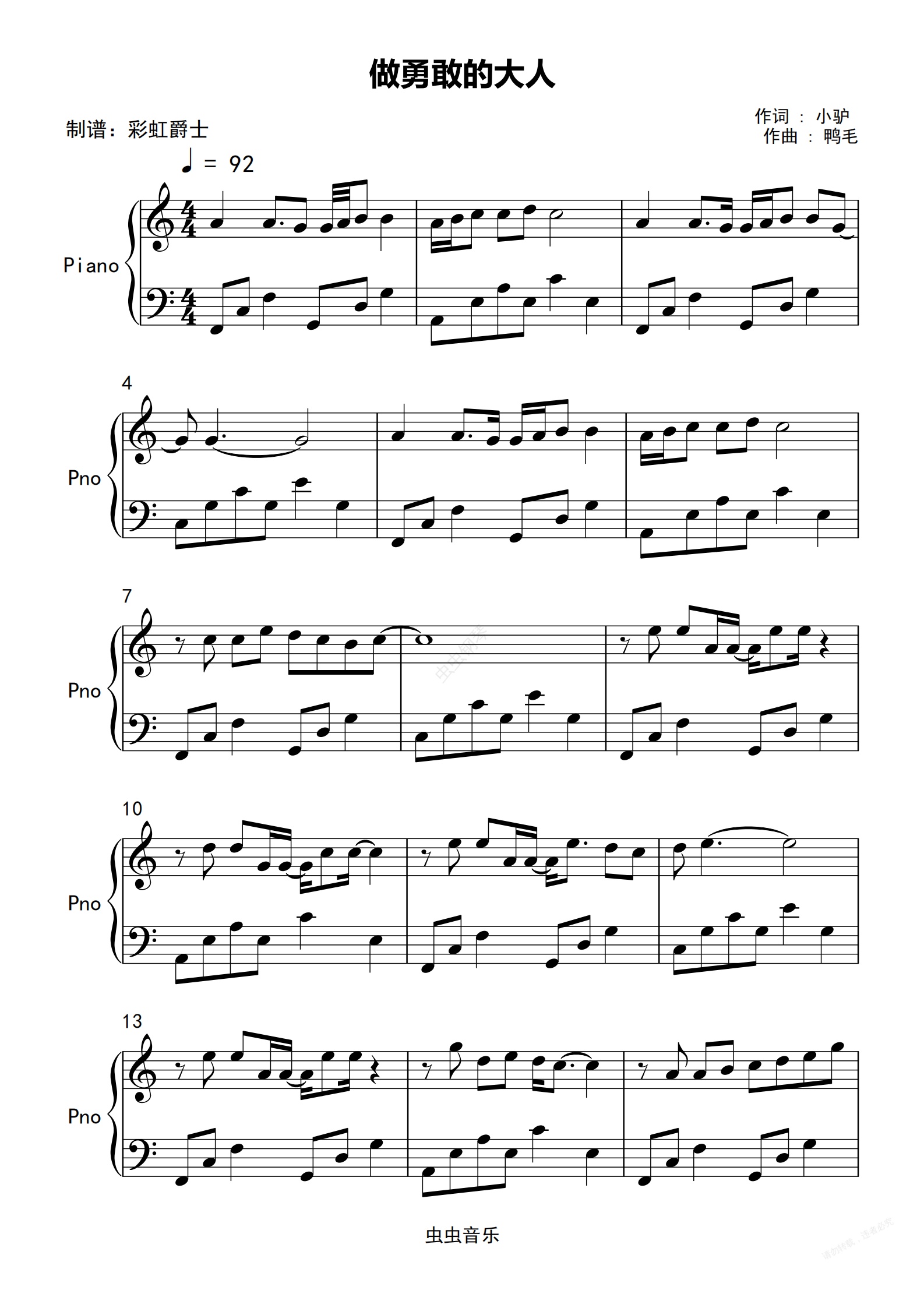 钢琴谱:做勇敢的大人-C调简单版-毕业主题曲