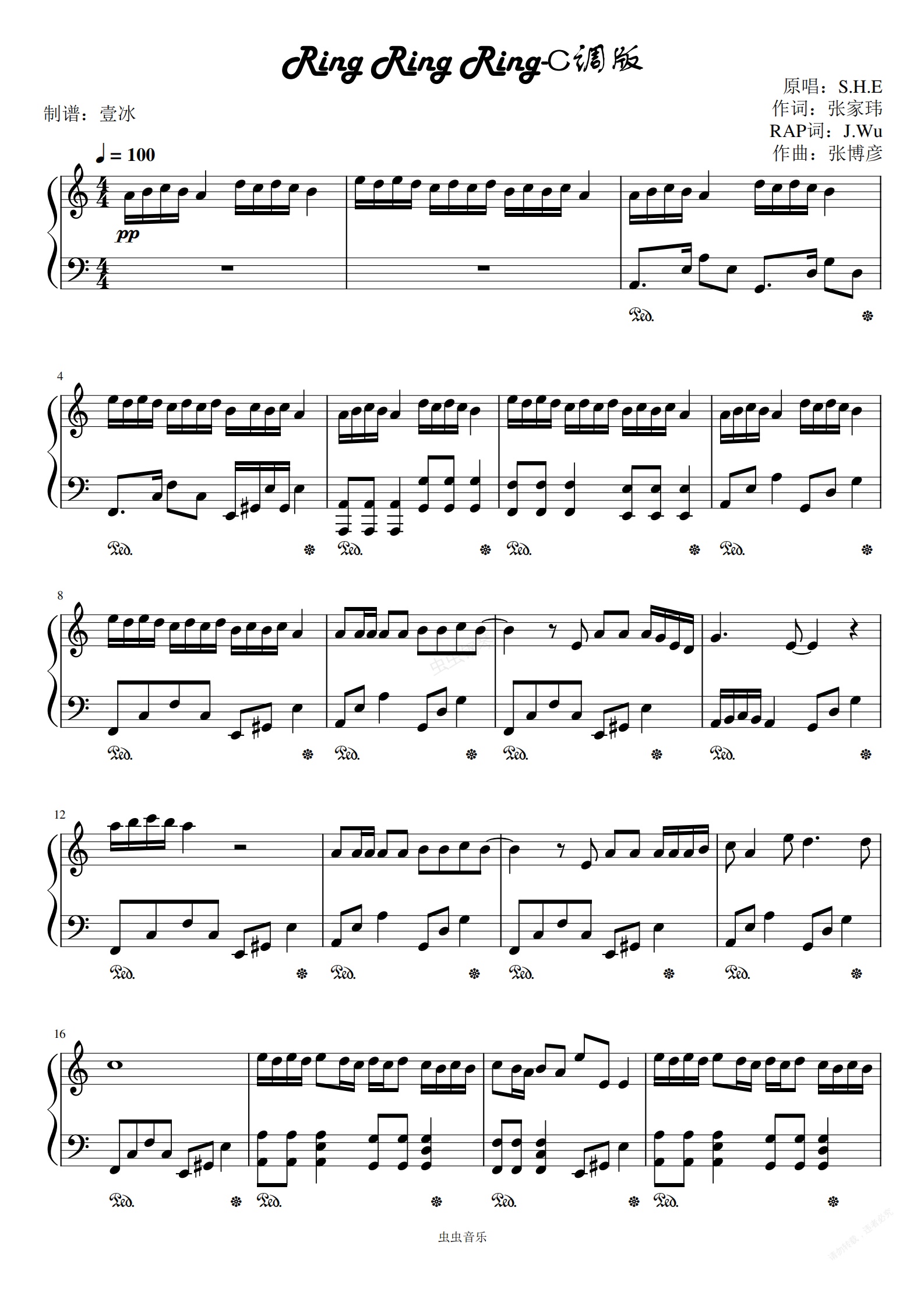 钢琴谱:ring ring ring//S.H.E-C调版