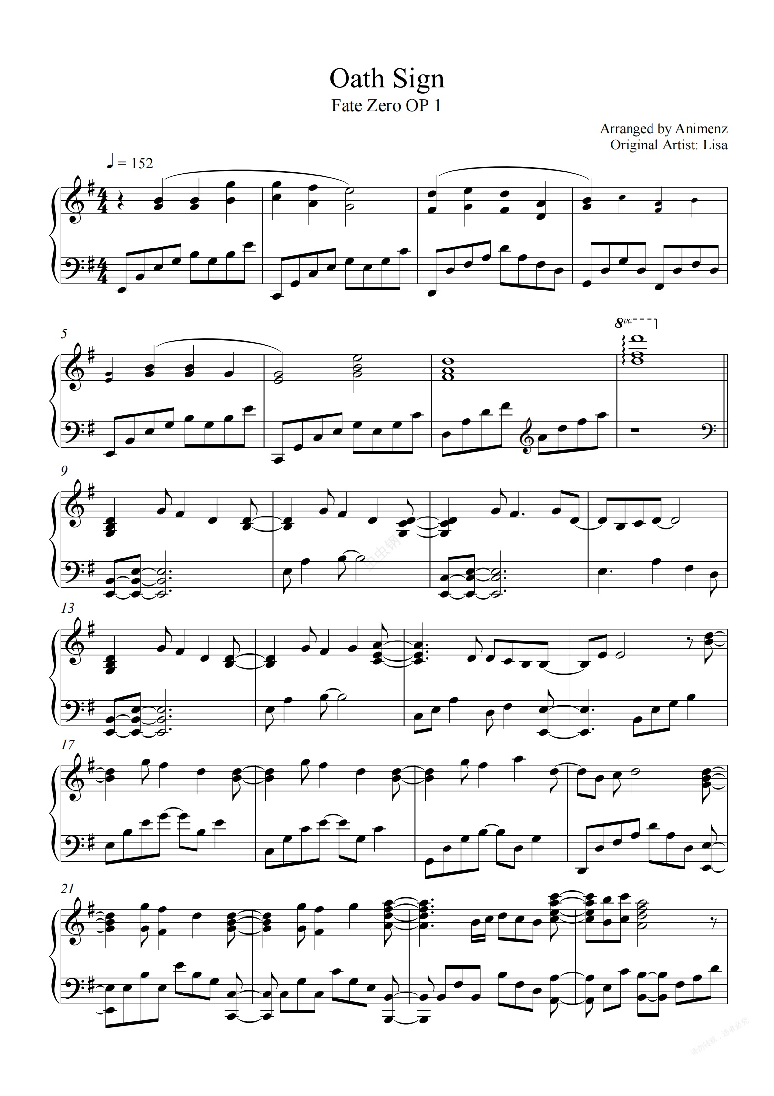 钢琴谱:Fate zero 插曲-Oath Sign 【免费谱】