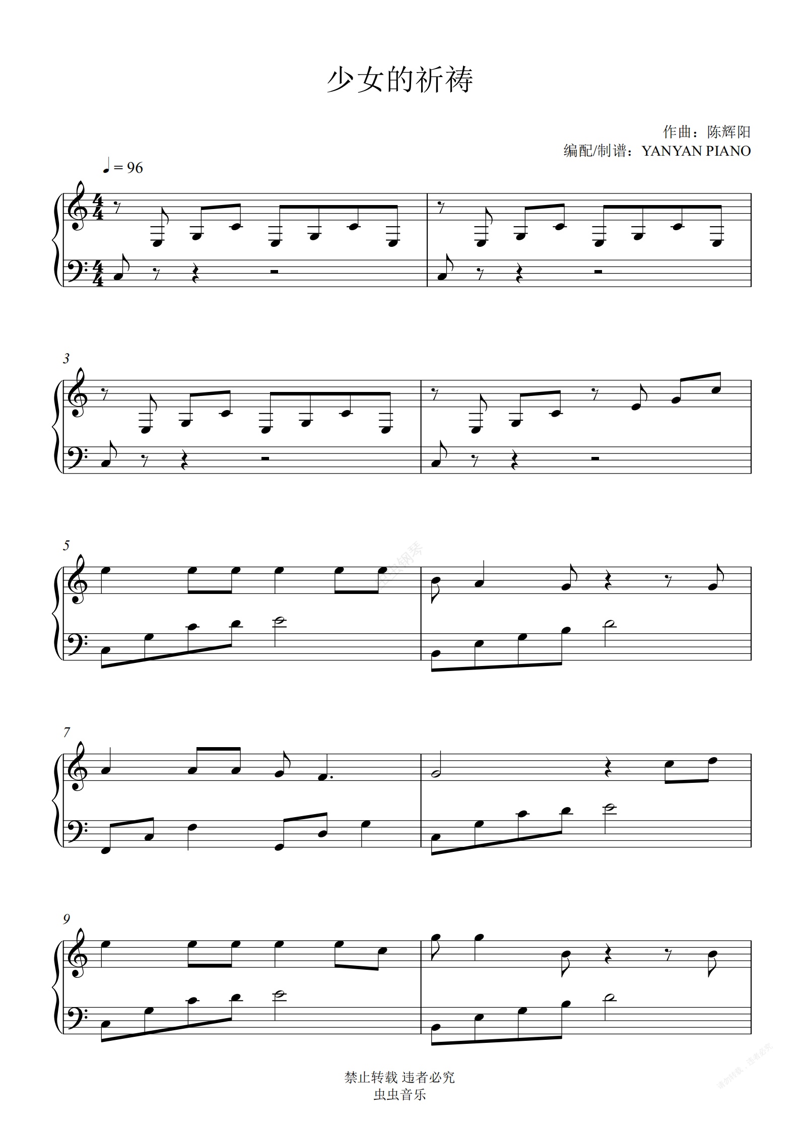 钢琴谱:杨千嬅【少女的祈祷】好听易弹