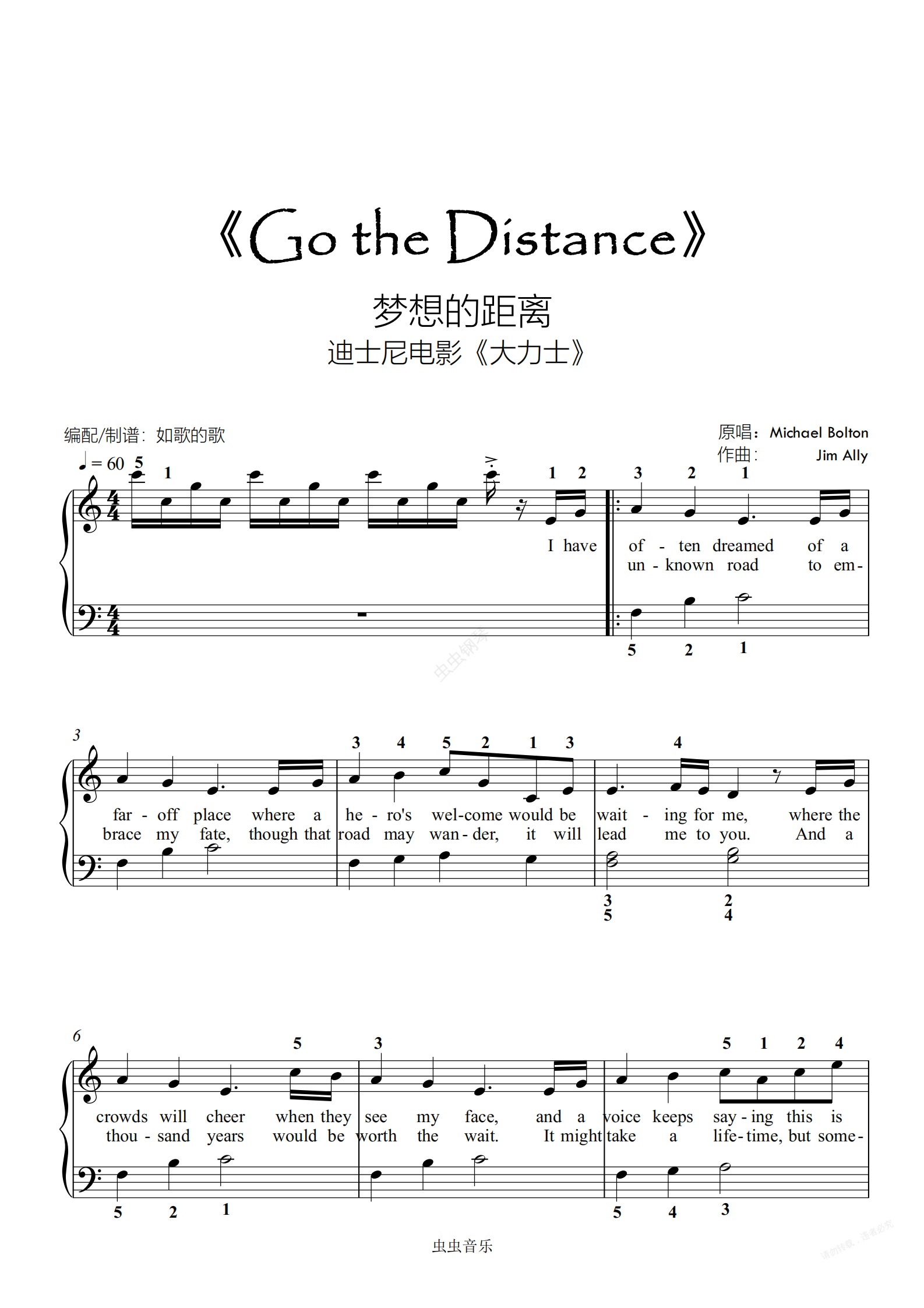 钢琴谱:Go the distance-迪士尼电影《大力士》Hercules配乐(入门可弹,大汤1,小汤3水平,带指法配完美歌词)
