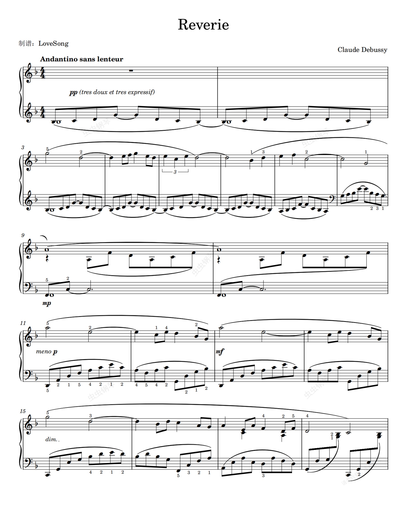 钢琴谱:德彪西 Reverie 梦幻曲 带指法 冥想曲 幻想曲