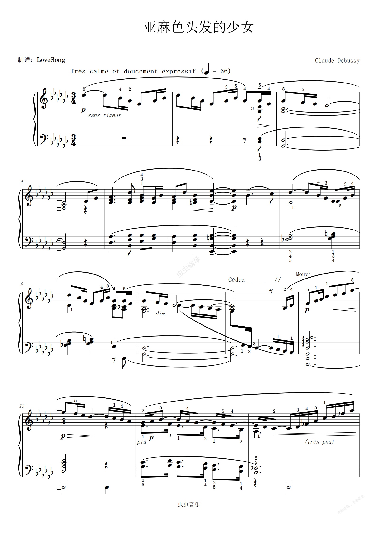 钢琴谱:德彪西 亚麻色头发的少女 带指法 棕发少女
