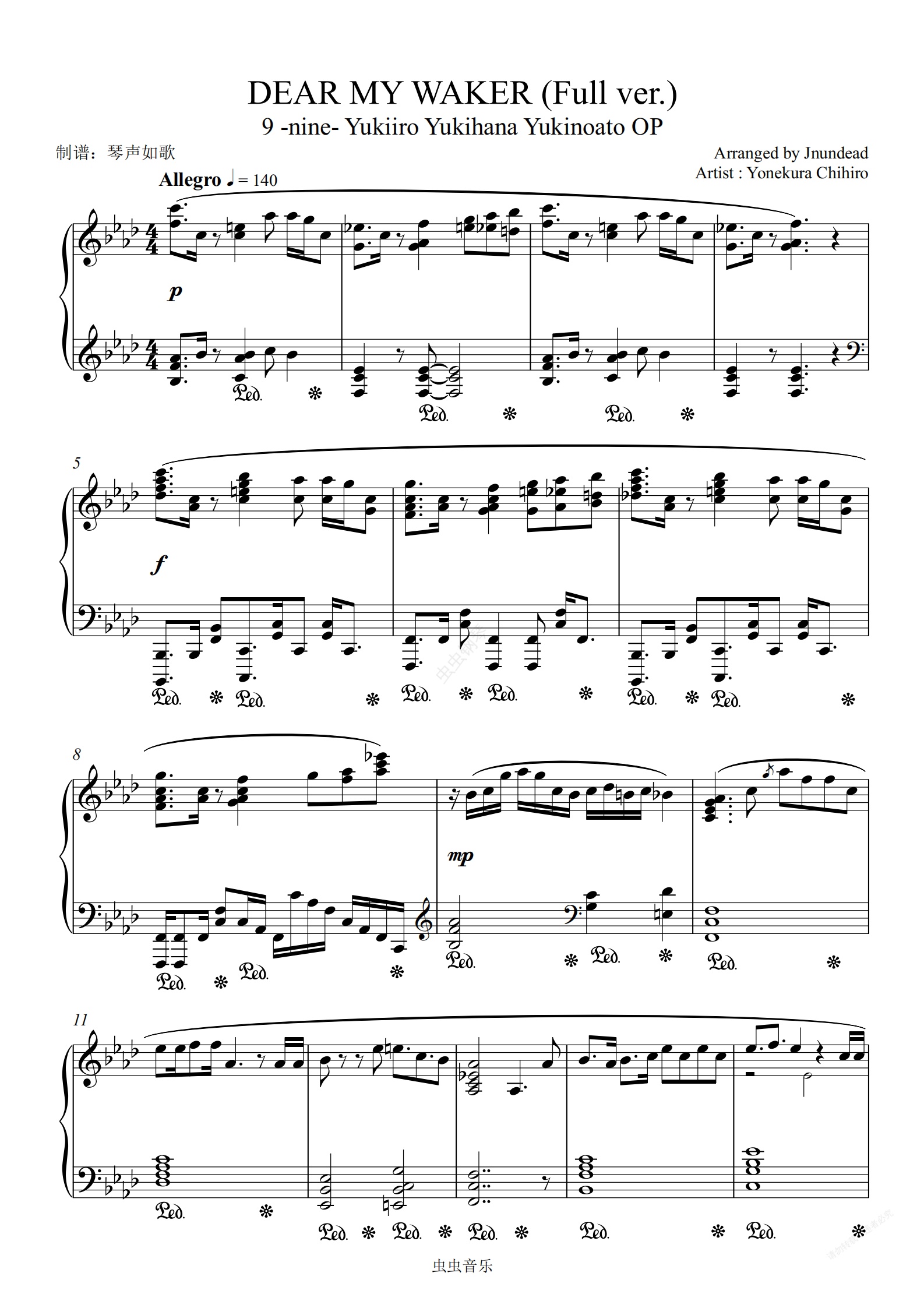 钢琴谱:DEAR MY WAKER -虻川治 (爆燃钢琴独奏)