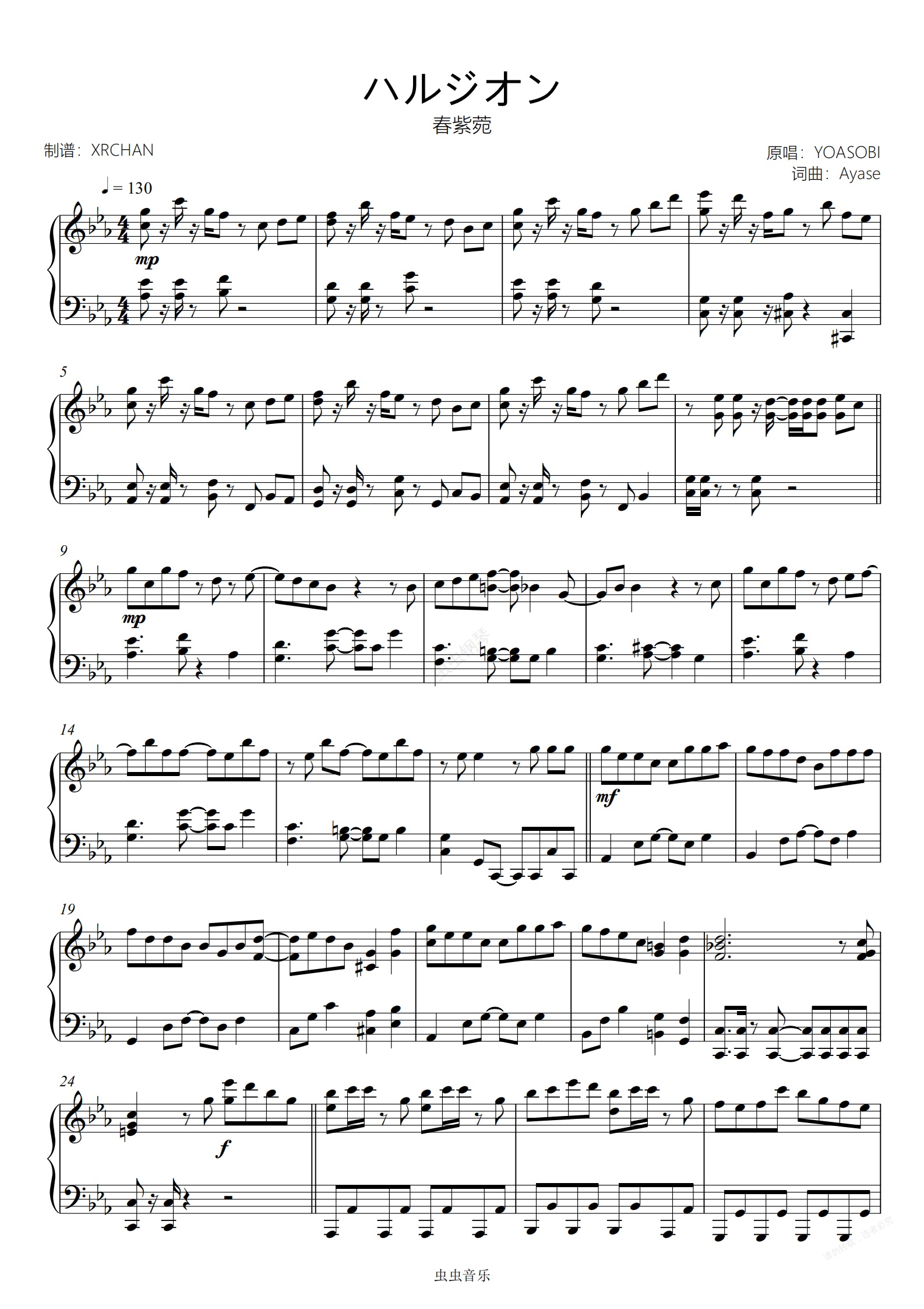 钢琴谱:ハルジオン(春紫菀)YOASOBI 初级 简单易弹