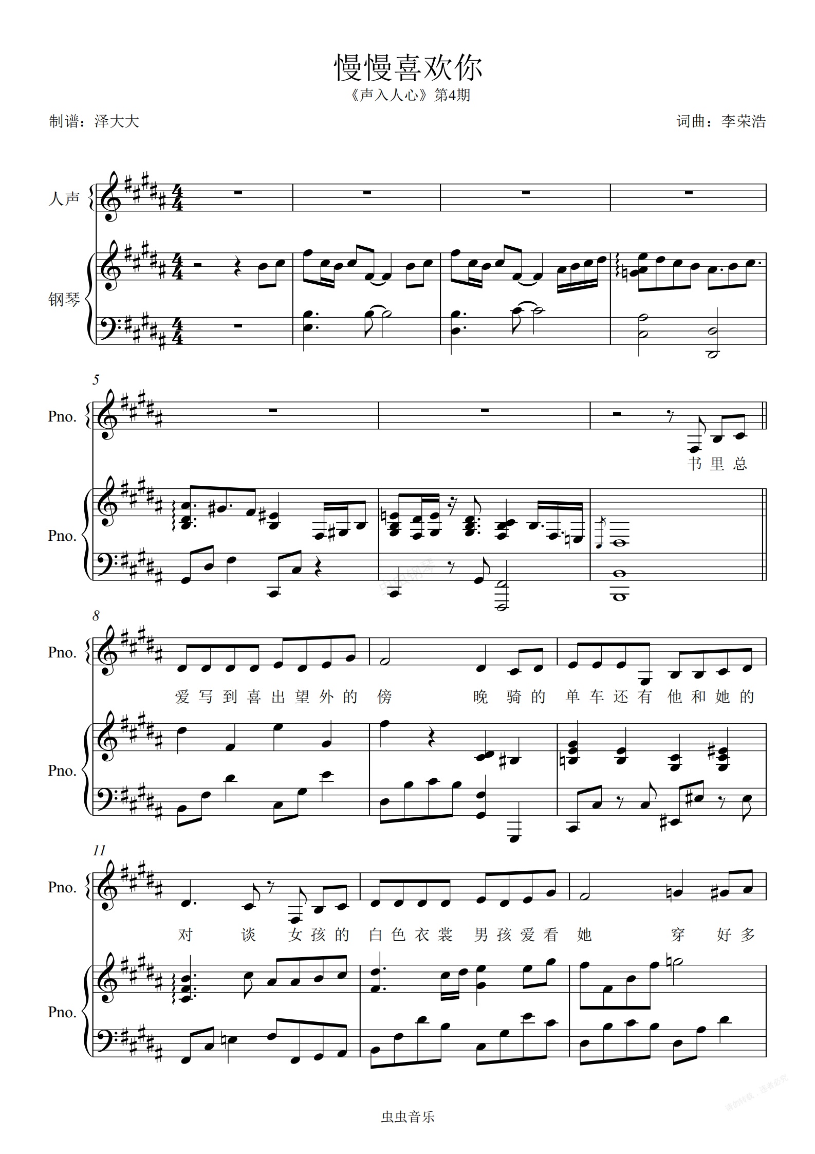 钢琴谱:慢慢喜欢你【声入人心 郑云龙/王晰 弹唱附词】泽大大