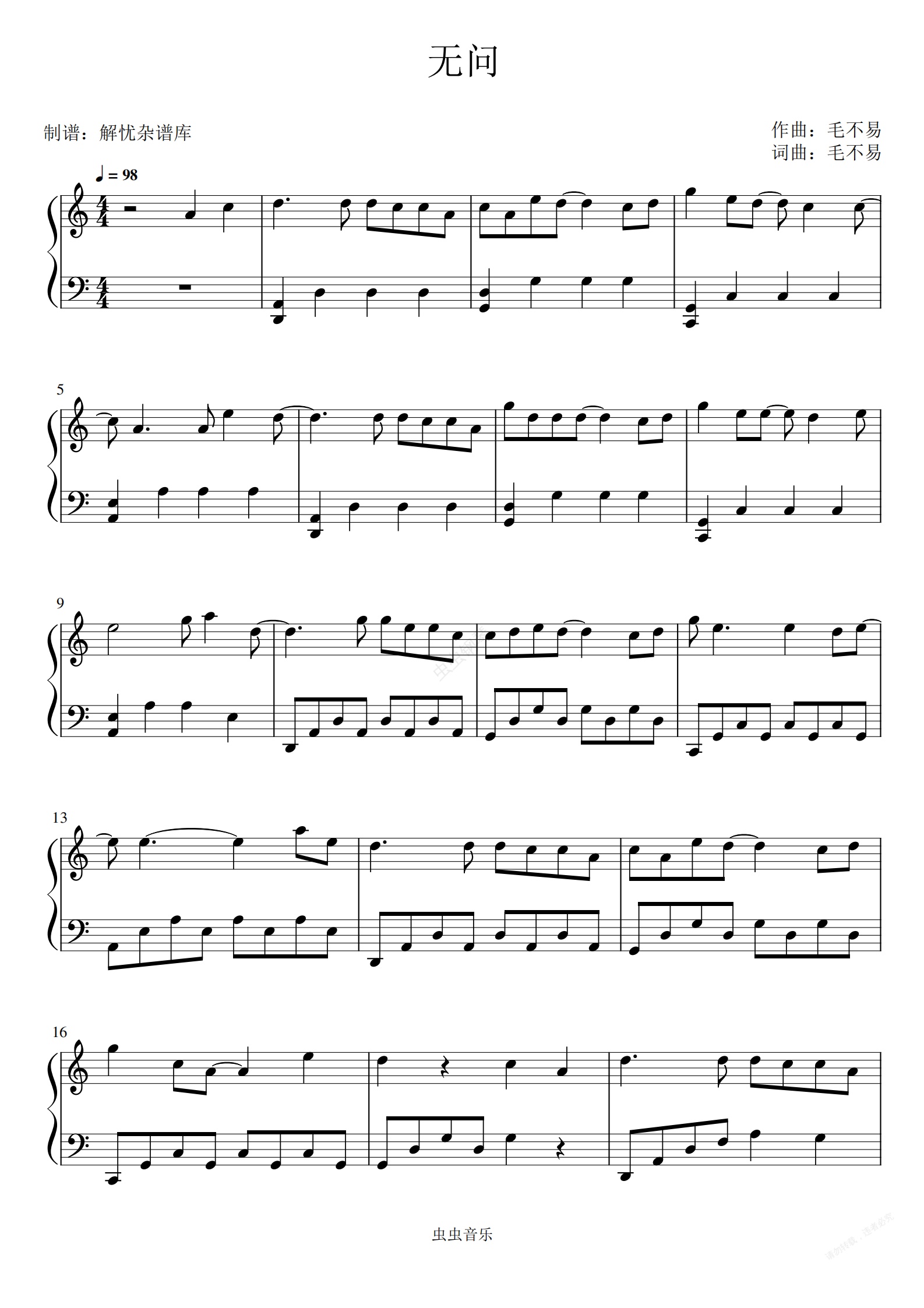 钢琴谱:无问