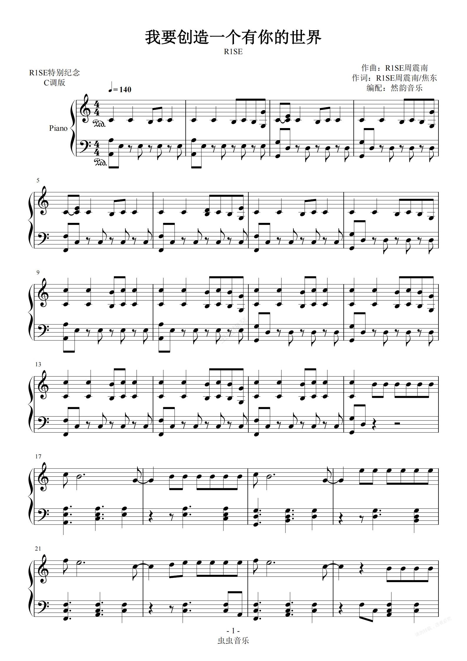 钢琴谱:【C调】R1SE-我要创造一个有你的世界 钢琴完美还原