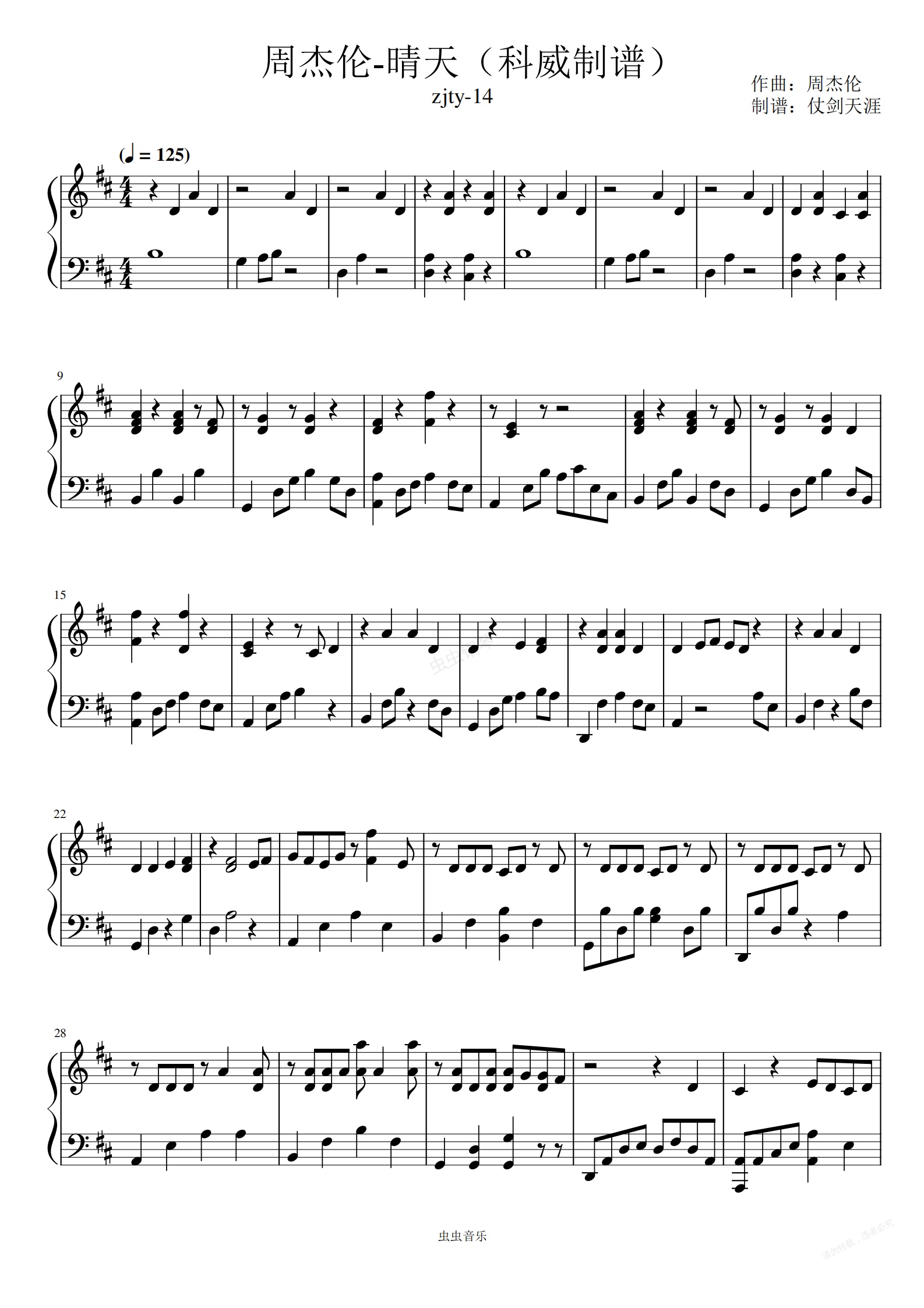 钢琴谱:周杰伦-晴天(完美演奏版zjty-14)