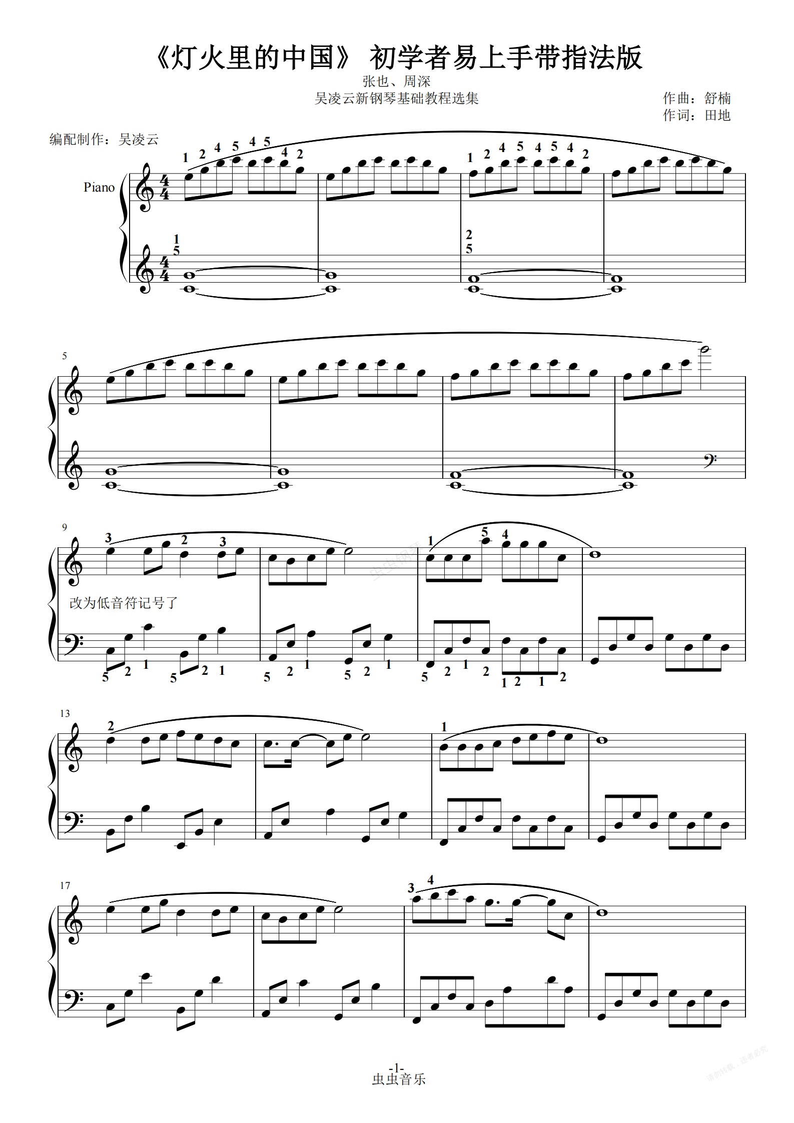 钢琴谱:灯火里的中国 初学者易上手带指法版 吴凌云新钢琴基础教程选集