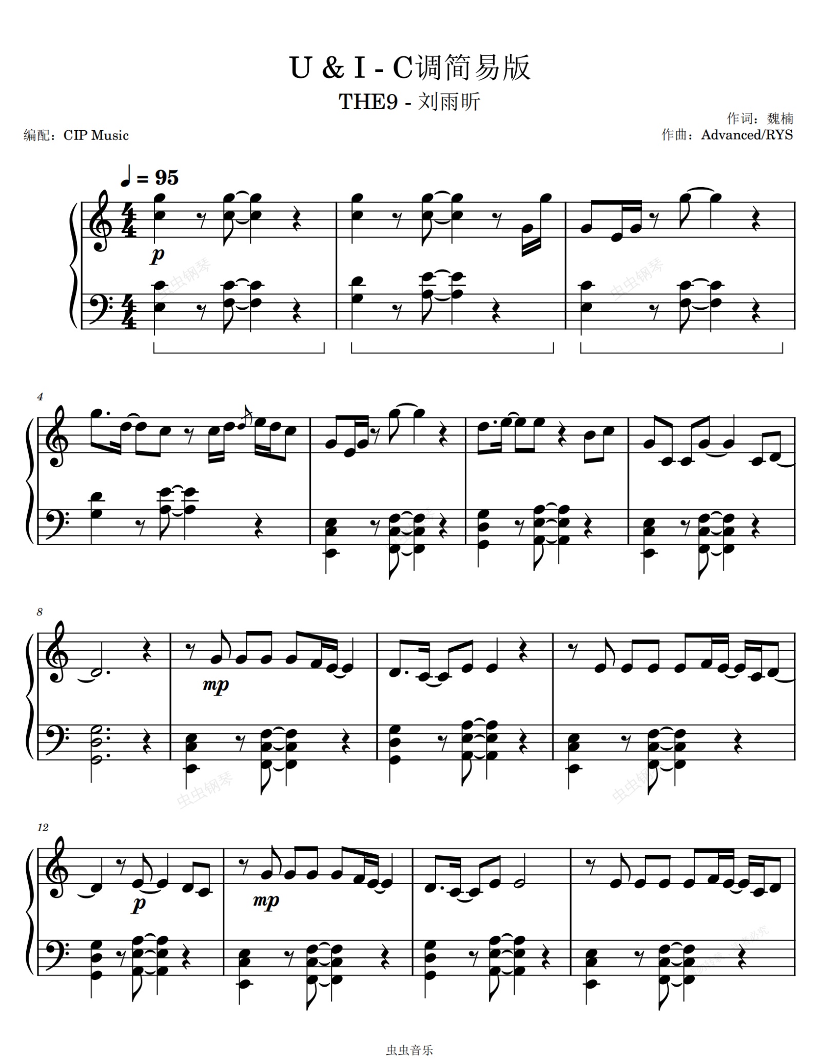 钢琴谱:《U&I》THE9-刘雨昕 C调简易版