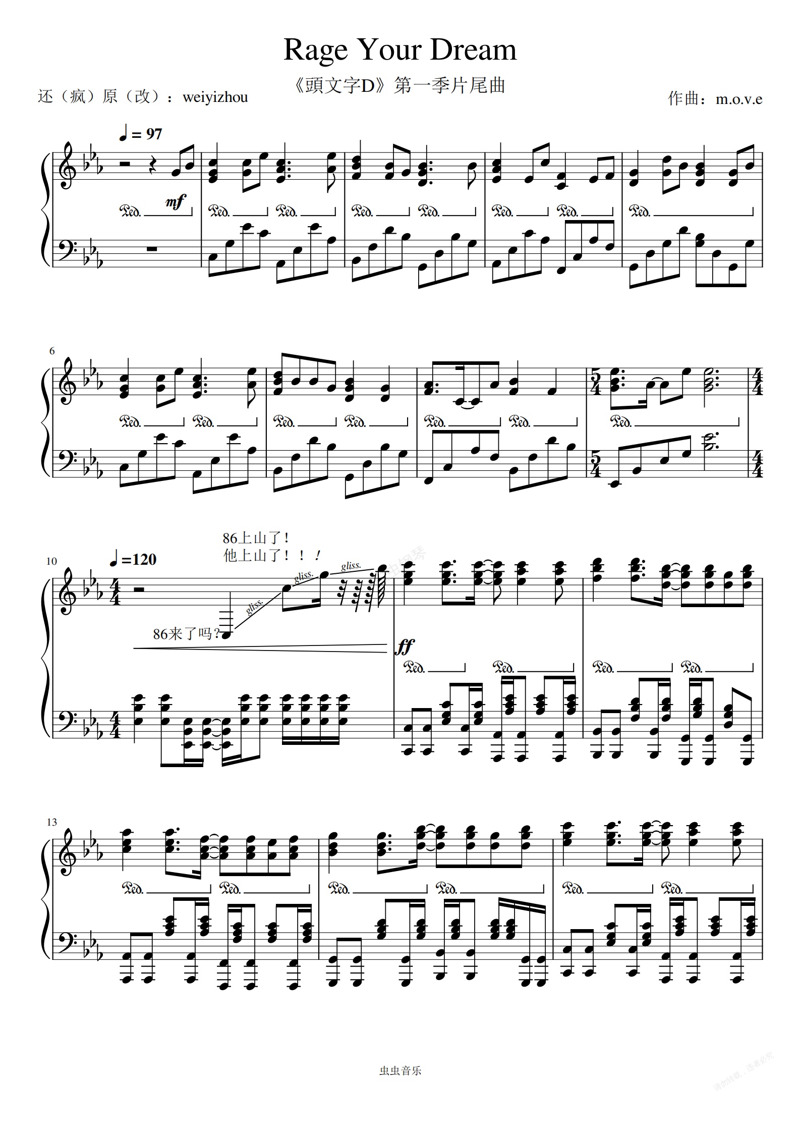 说正话,建议不要试图一个人驾驭(建议先征服我的千本樱),请小伙伴四手联弹是个很棒的选择(左手部分任重而道远啊),当然可以简化来弹,一些地方避免单调重复我加了自己的花样(第58小节)。(那个刮奏直接刮上去就OK,一来不是很会用软件的刮奏,二来。。。不好意思,乱刷梗,球球别喷我。。。)