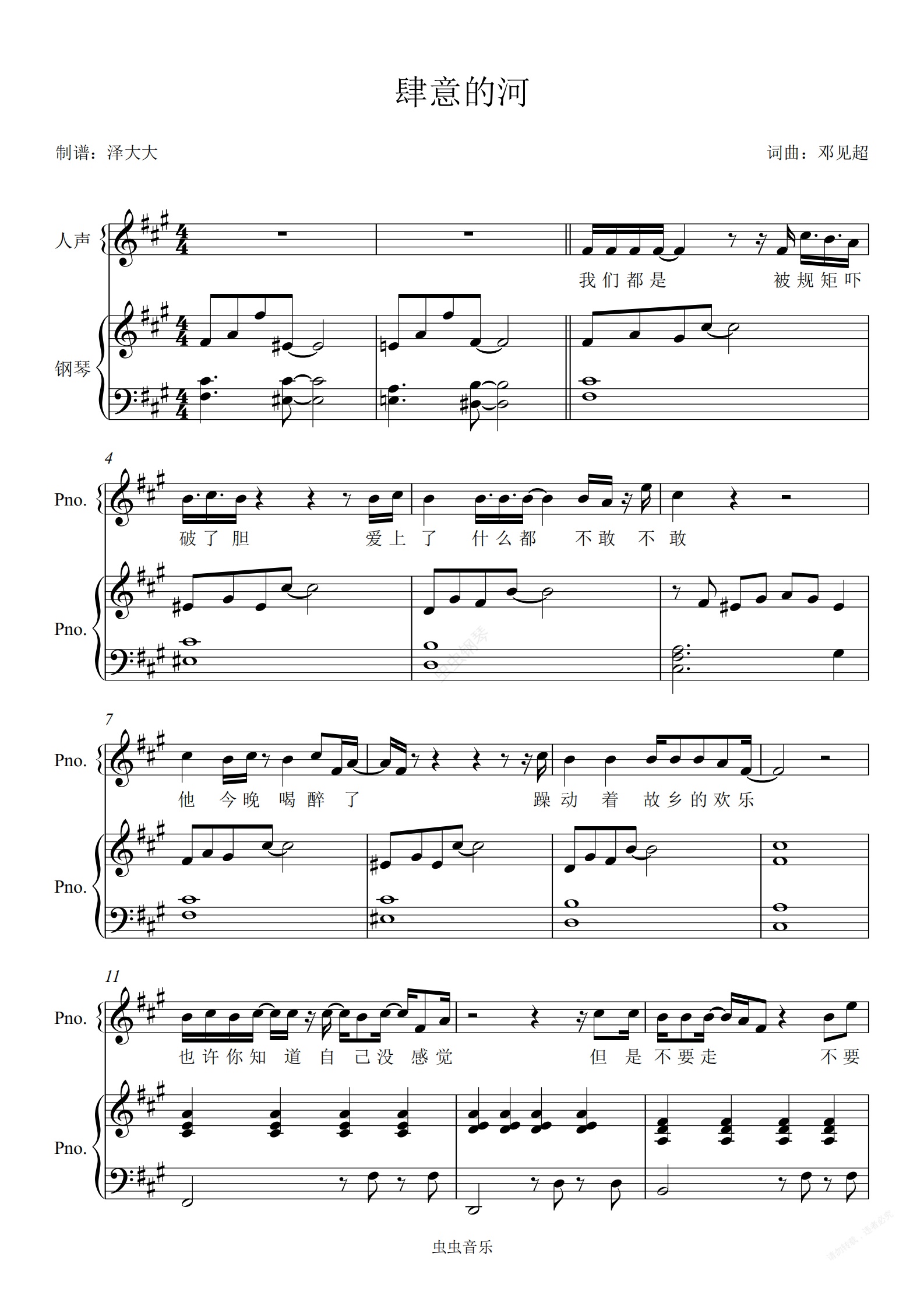 钢琴谱:肆意的河【完美弹唱附词】泽大大 邓见超
