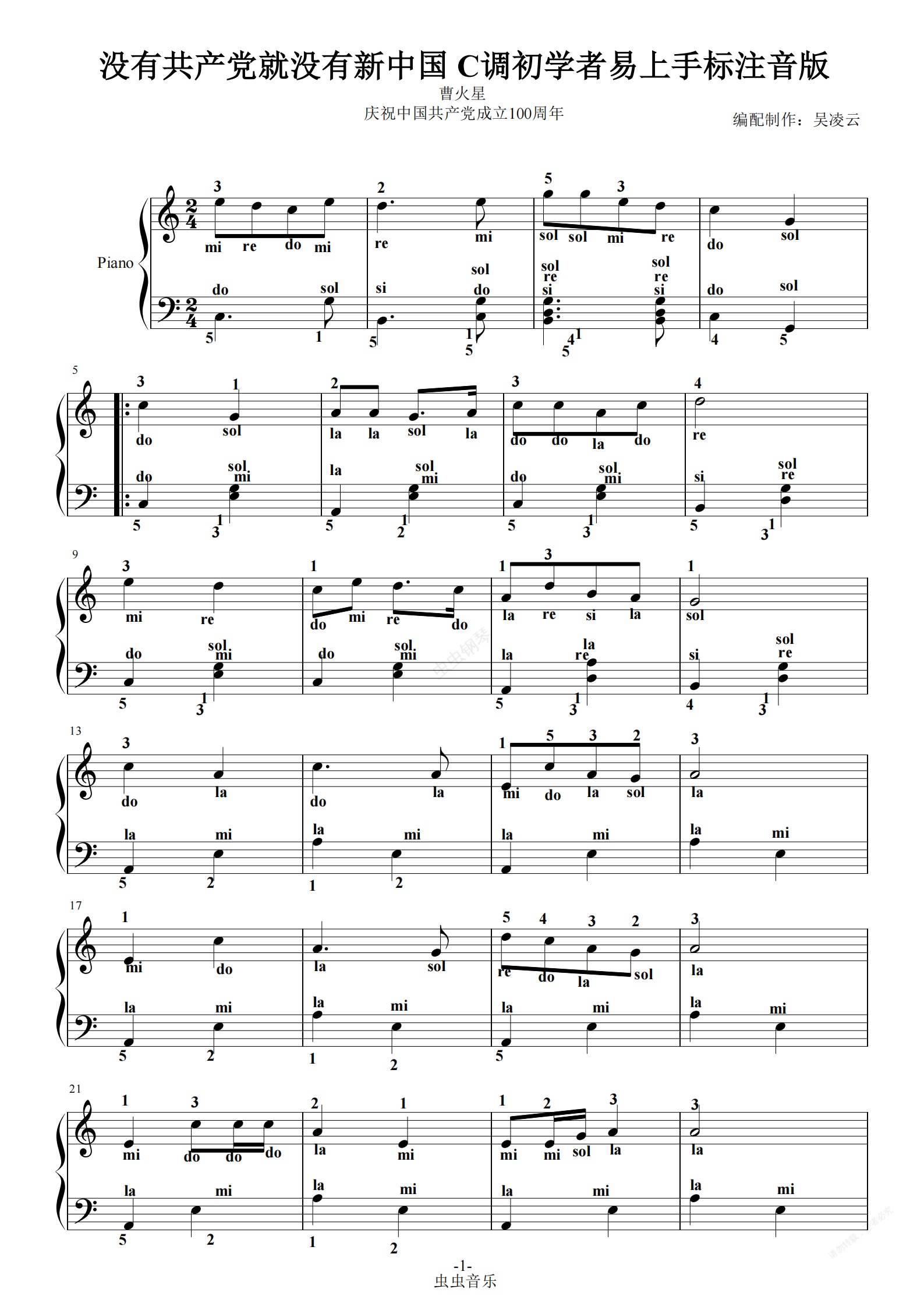 钢琴谱:没有共产党就没有新中国 C调初学者易上手标注音版 吴凌云新钢琴基础教程选集