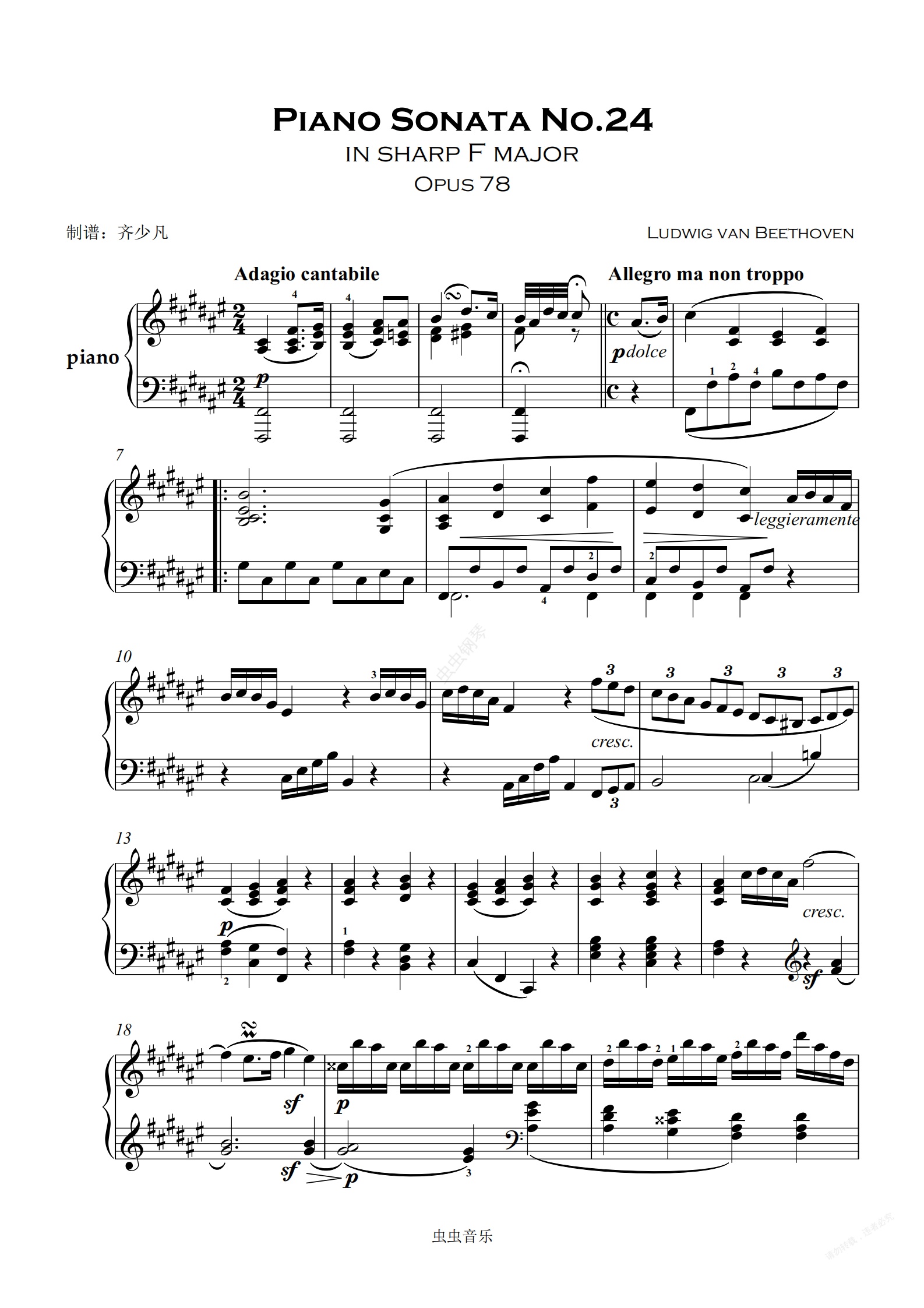 《升F大调第二十四钢琴奏鸣曲》Piano in Op.78 ,作于1809年,是贝多芬中期作品.这首作品结构小巧、幽静而又温文尔雅,发挥了钢琴纤细微妙的表现力.题献给泰丽莎·冯·布伦斯维克 (1775-1861),匈牙利弗朗茨·冯·布伦斯维克伯爵的妹妹,因此也有“泰丽莎奏鸣曲”之称.她曾经是贝多芬的学生,这位贵族千金具有非凡的音乐天分,并擅长绘画,她曾把自己的一幅肖像画赠给贝多芬,题词是:“给稀有的天才,伟大的艺术家,善良的人。T.B。"他们之间有一段相爱的日子,曾经有过婚约,却在四年后解除了。